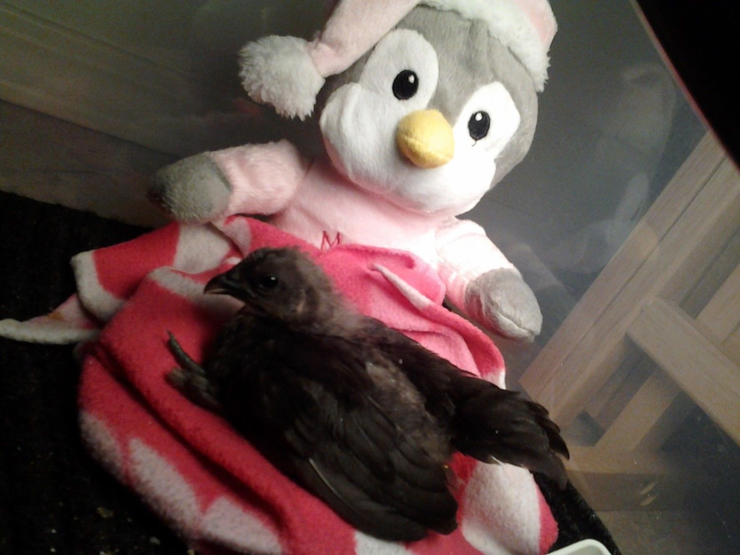 Still getting vitamins/electrolytes in it's water, 3 drops of Poly ViSol vitamins a day, boiled egg yolk (don't like scrambled) & chick feed. I put the food on a napkin at the edge of the duster, she reaches out to eat & has walked hobbled to the water to drink (elevated in a small lid) and hasn't knocked it over (yet). Today I noticed she prefers to stay under the duster & goes into the opposite side of the box to poo