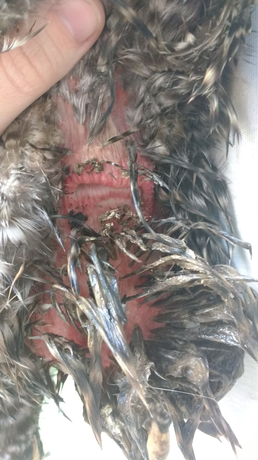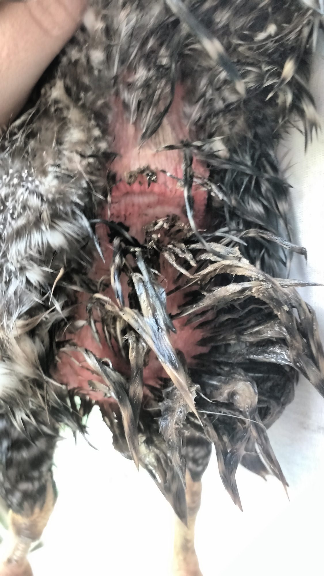 I just lost two chickens to tumors so I'm a little skiddish. We picked up Ethel to inspect her vent and it looked horrible - the feathers were clumped and dirty and lots are missing. We tried giving her a little bath (which she hated), but the vent looks a little better now that it's cleaner. Any thoughts - is she just molting? She's laying still, but her egg shells are getting thinner and thinner. We haven't seen any worms in their poop and they free range in our grassy backyard all day. Her feathers are wet in the picture. Thanks.