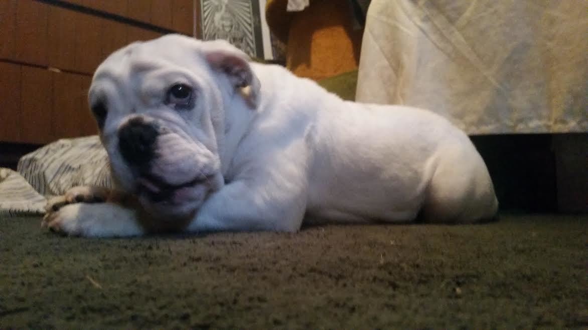 the first couple days I had my english bulldog my deaf pitbull would growl when the puppy tried getting her food so I would show the older one it was mine to protect not hers by taking it away and putting both of them up.
