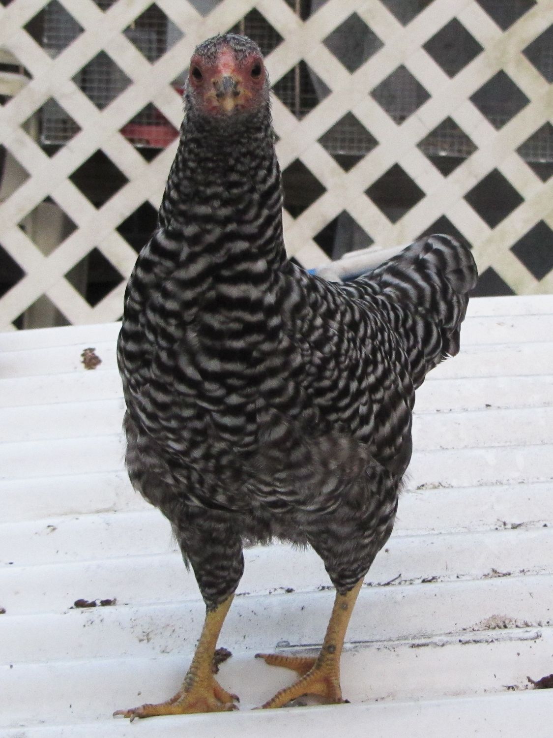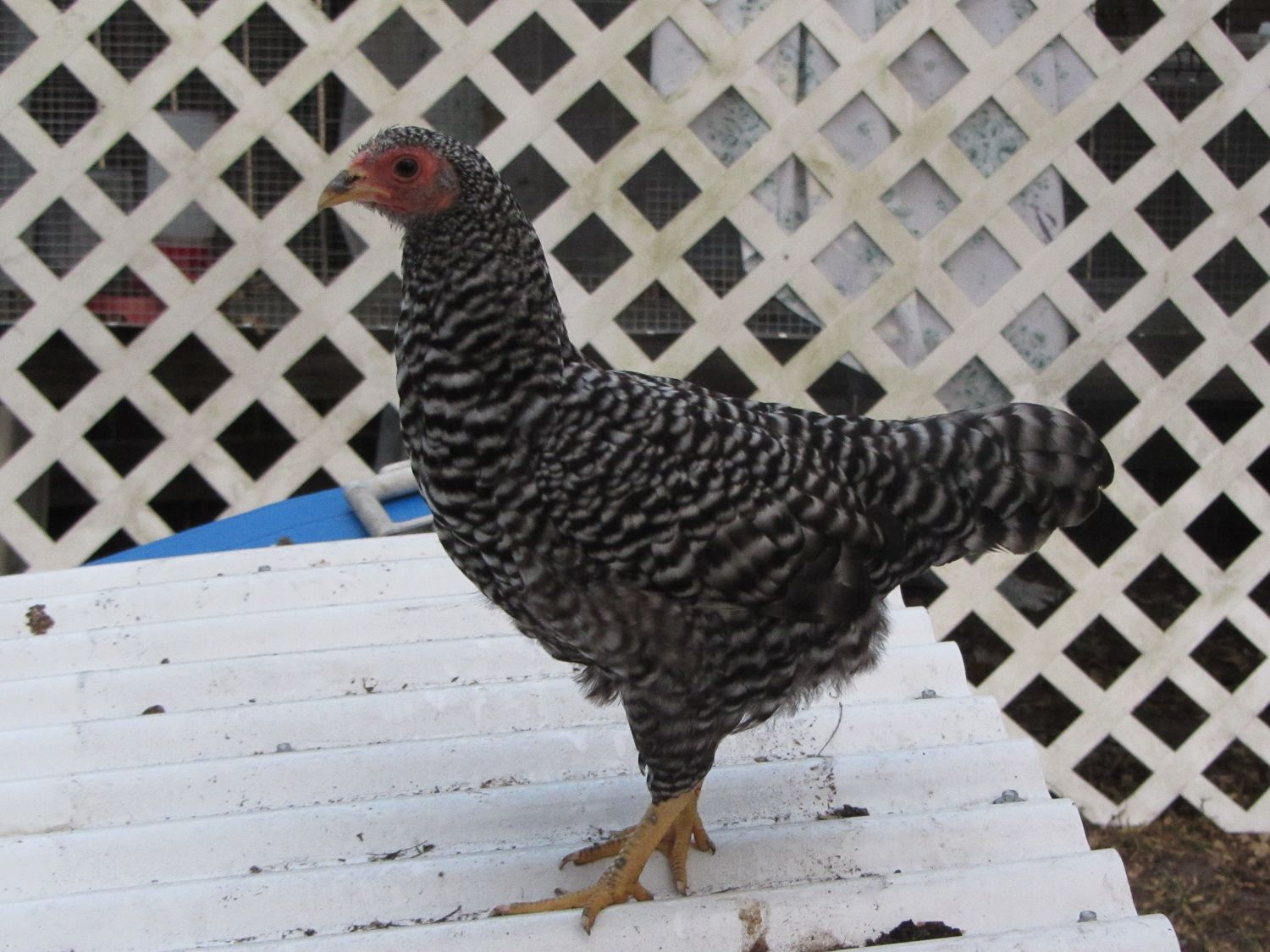 One of my 12 week old Dominique pullets. They are huge! Also, I never appreciated how deep their voice would be.