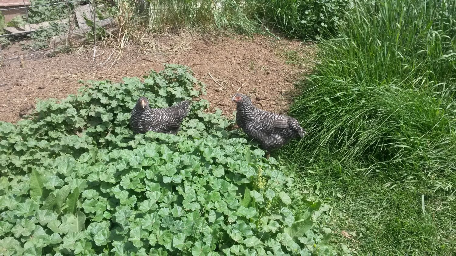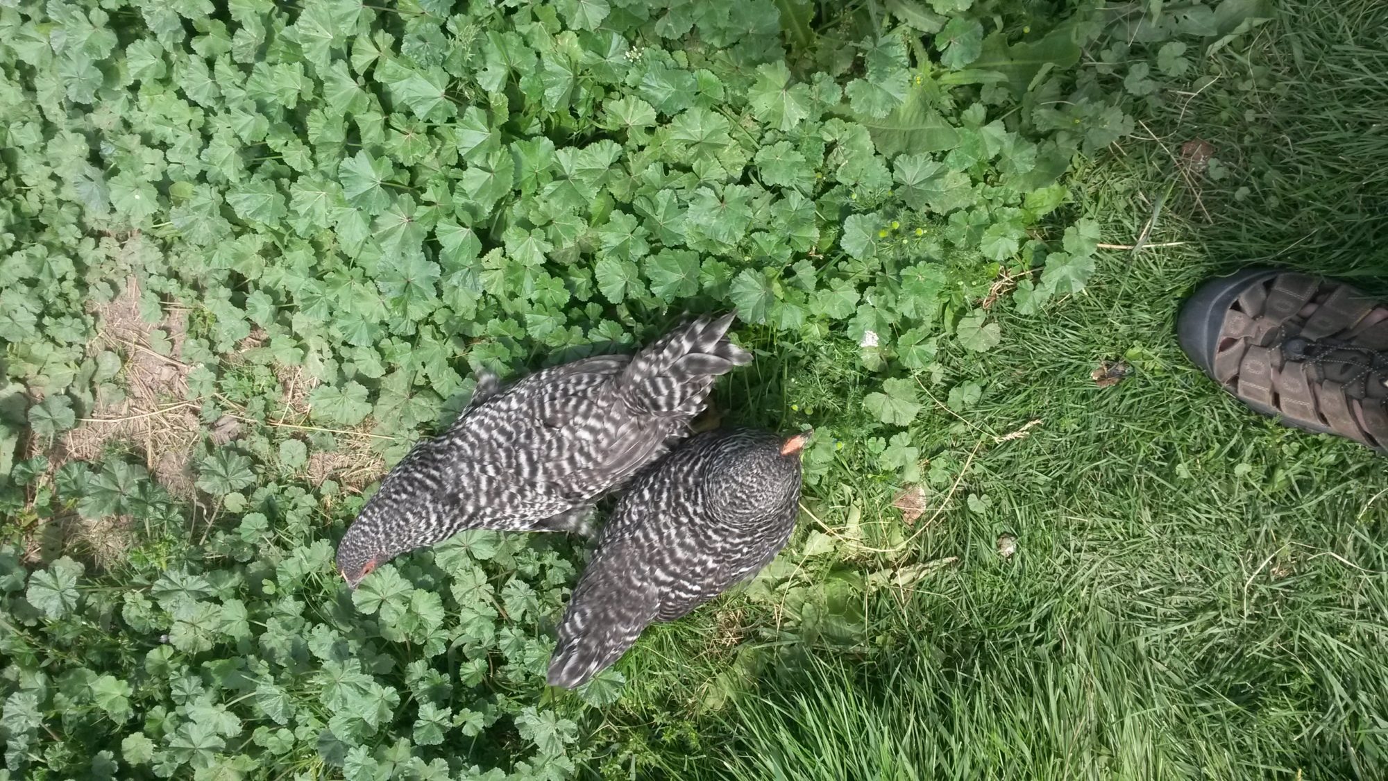 Our Dominiques have been very good at clearing away caterpillars climbing the trunks or living among the roots of our fruit trees; they also harvest the June drop and other fallen fruit. We had a couple of patches of weeds - but the Dominiques have been great helpers in clearing them out. The other day one appeared to be chasing a hummingbird under the belief that this must be the world's largest *bug.*