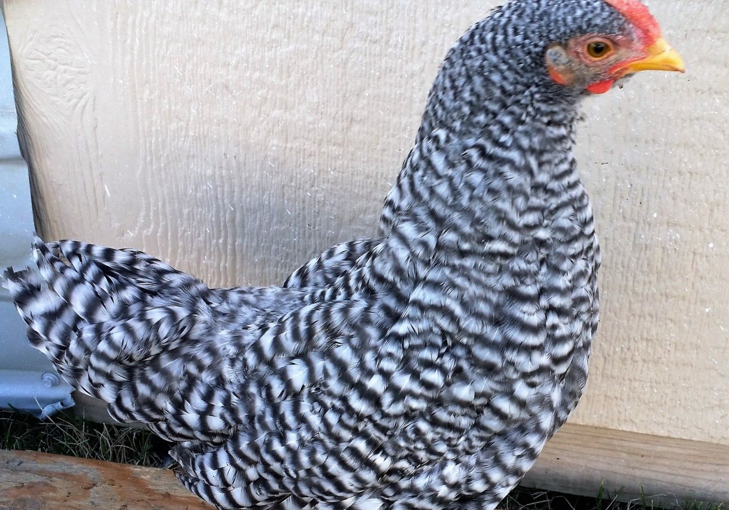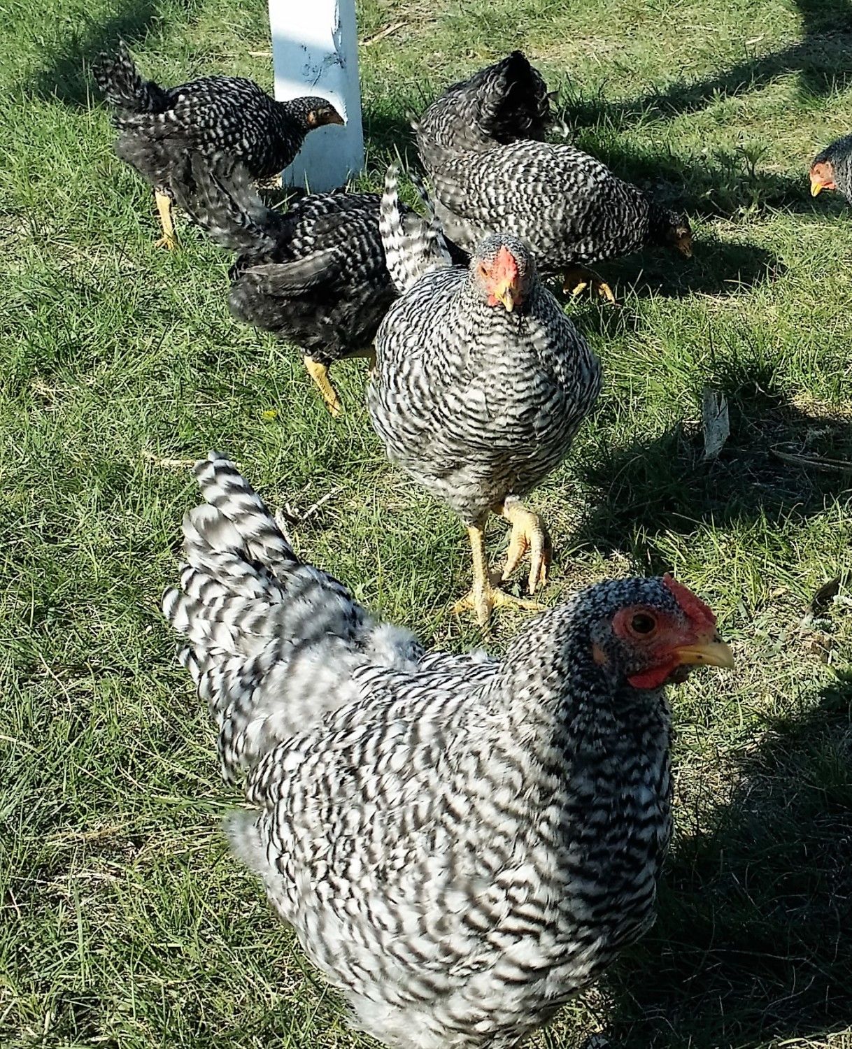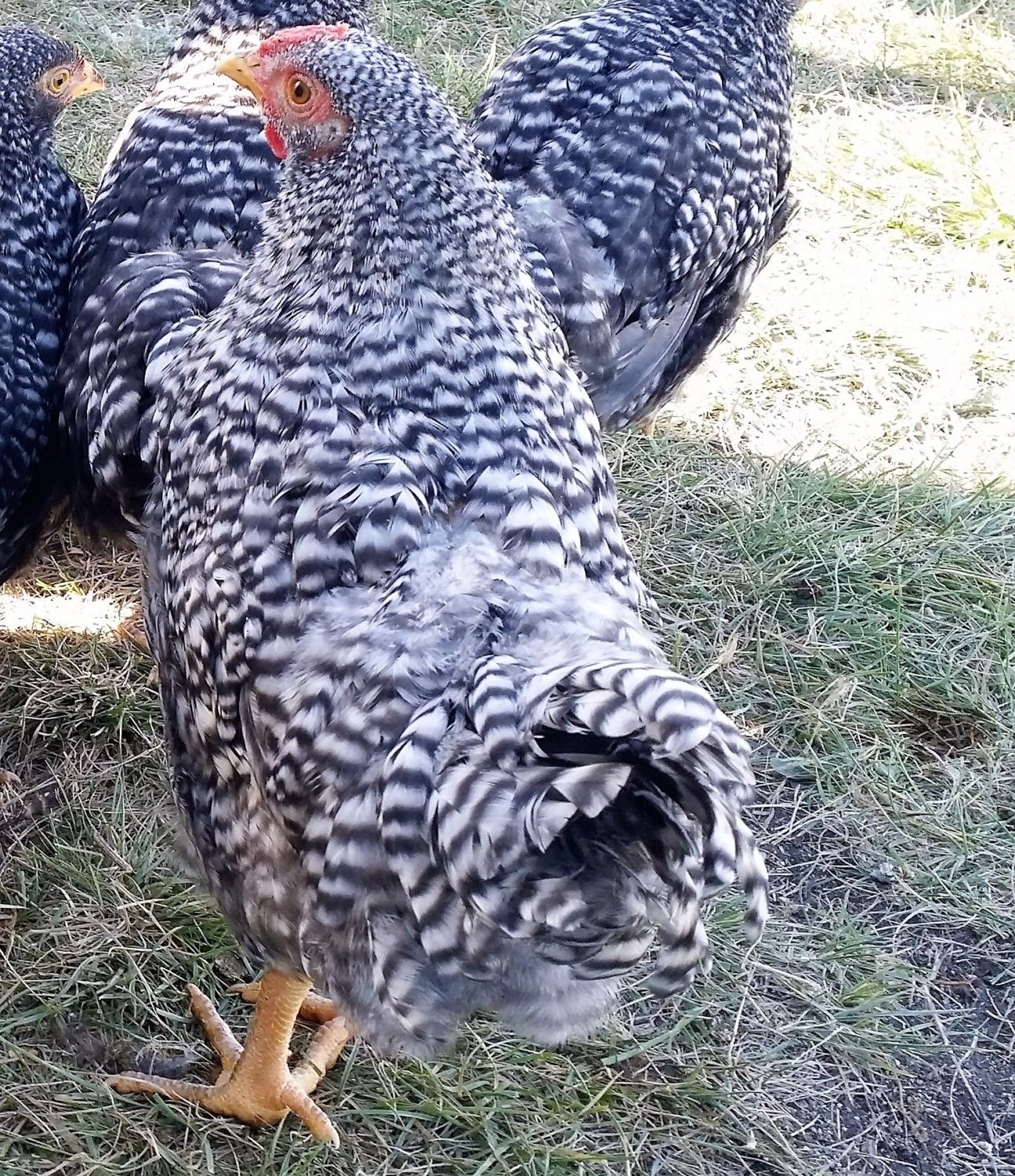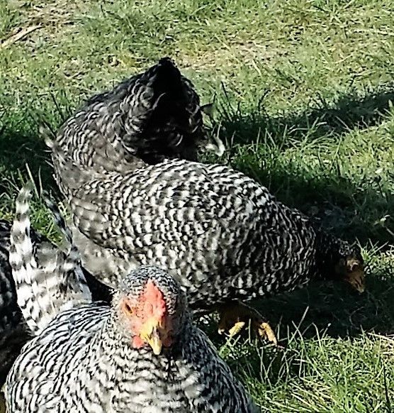 I, for one, am interested in the outcome of your Cackle Doms. I'm particularly interested in the U-shape back on the hens and their rosecomb leaders (spike). For some reason not all the Doms get the leader at the back of the comb and that is such an endearing appearance that completes the Dom.Okay, i took some pics with my phone after forcing my young dominiques out of the coop into twenty mile an hour winds and cold, but hey, the sun was shining. Most of the pics were of them sort of hunkered down, or showing all sorts of bad molt views. Only about six birds out of twenty have much for tail feathers, right now. But will share a couple of shots, cuz people here are curious about the recent Cackle birds. I'm liking them a lot. I know that i'll probably need to work on getting the black out of the beaks and legs.