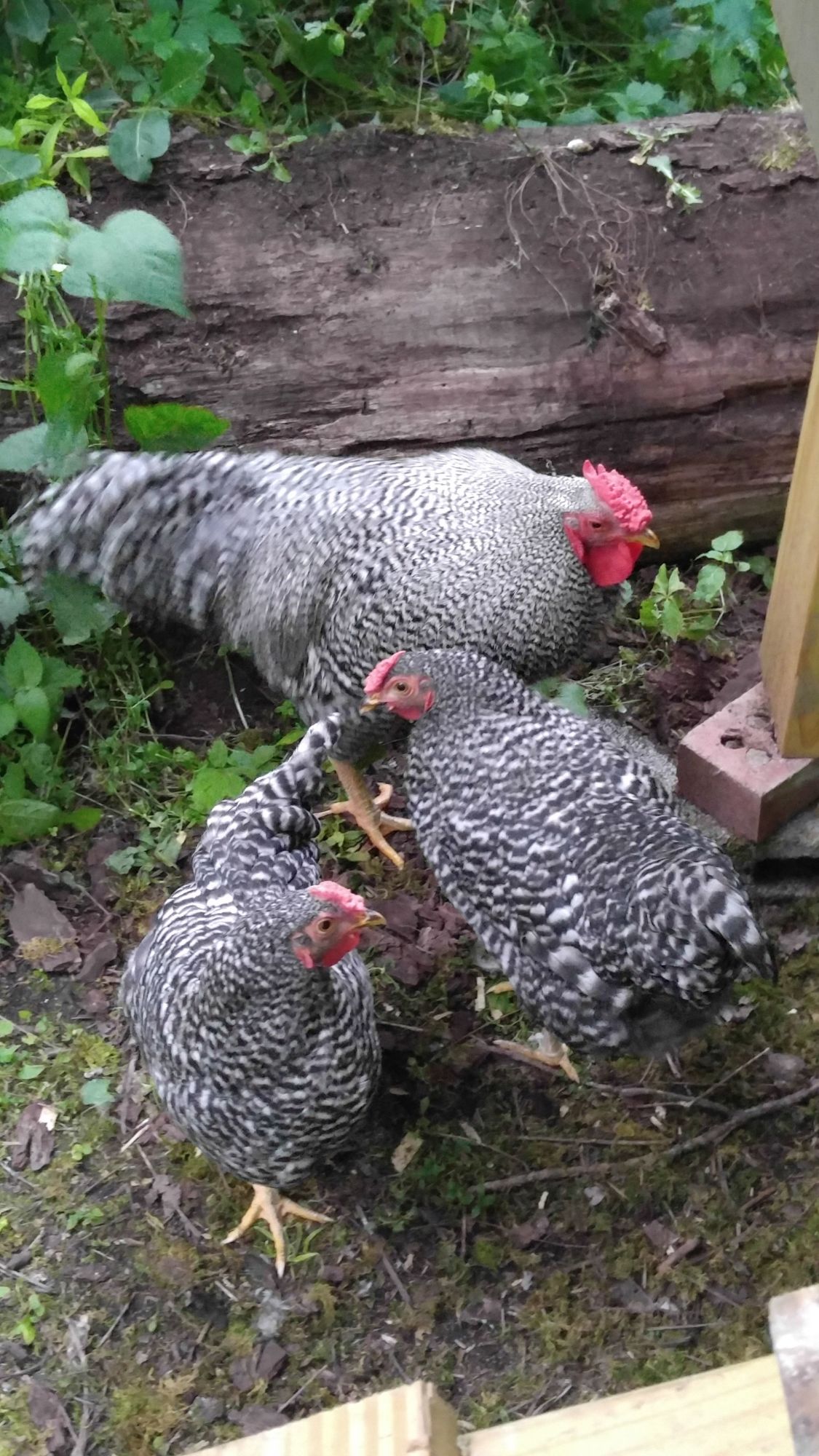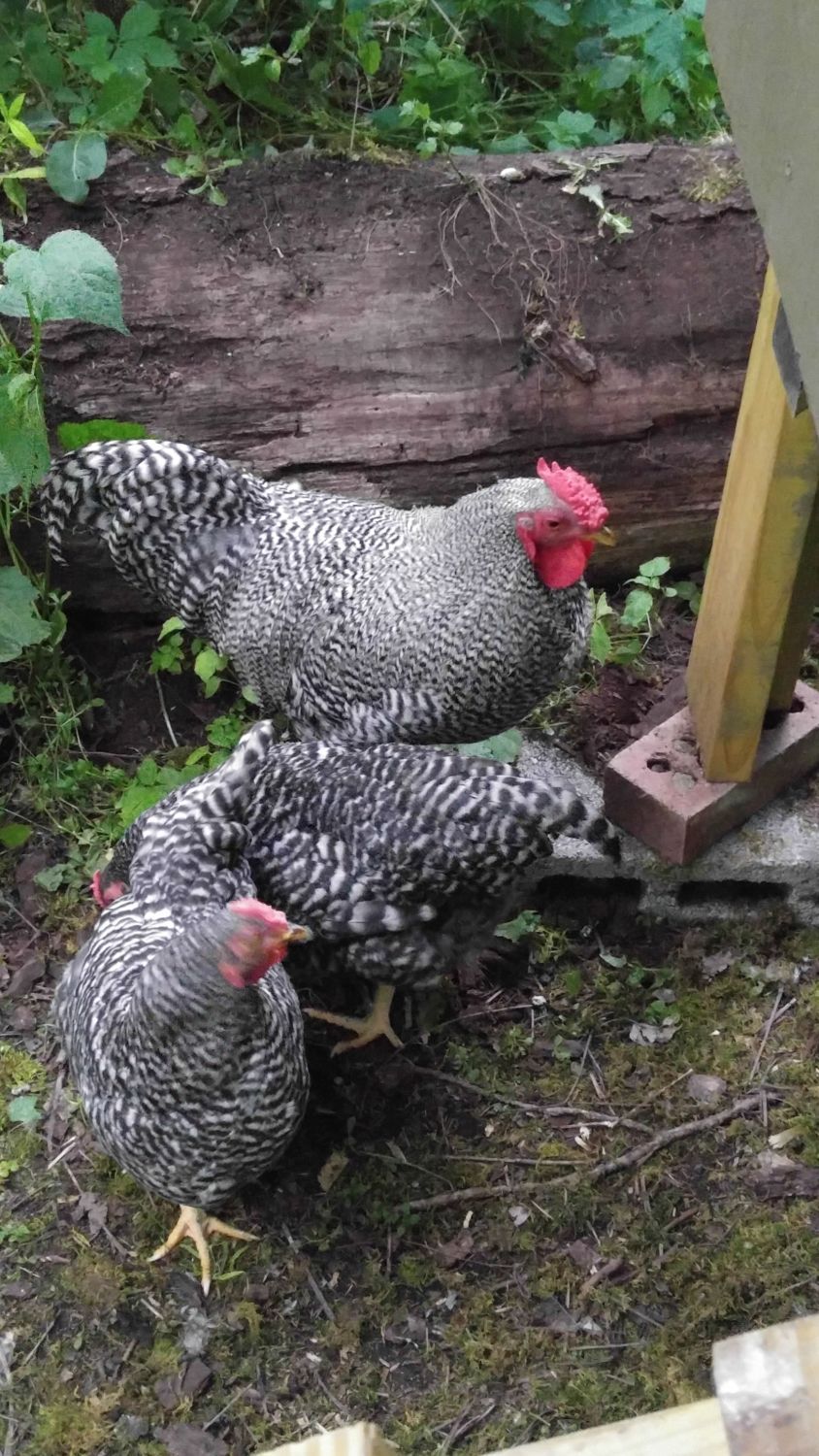How old are they? I love Doms for their personality first and foremost. Next I like the leaders (spikes) at the back of the rosecomb, and then I like the pretty U-shape profile on the backs of both sexes. Many concentrate on feathering and other qualities but the first 3 I mentioned are the most important to me that makes the Dom unique as soon as you spot them in a flock. It could be the way Stewart is posing but I don't see the traditional U-shape back on him.