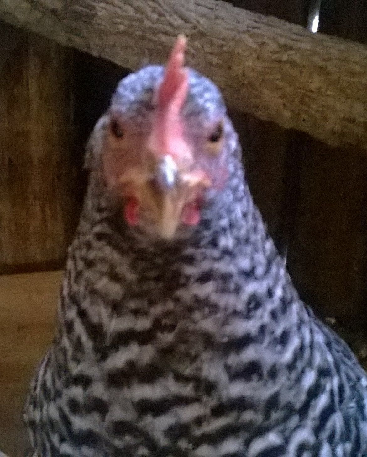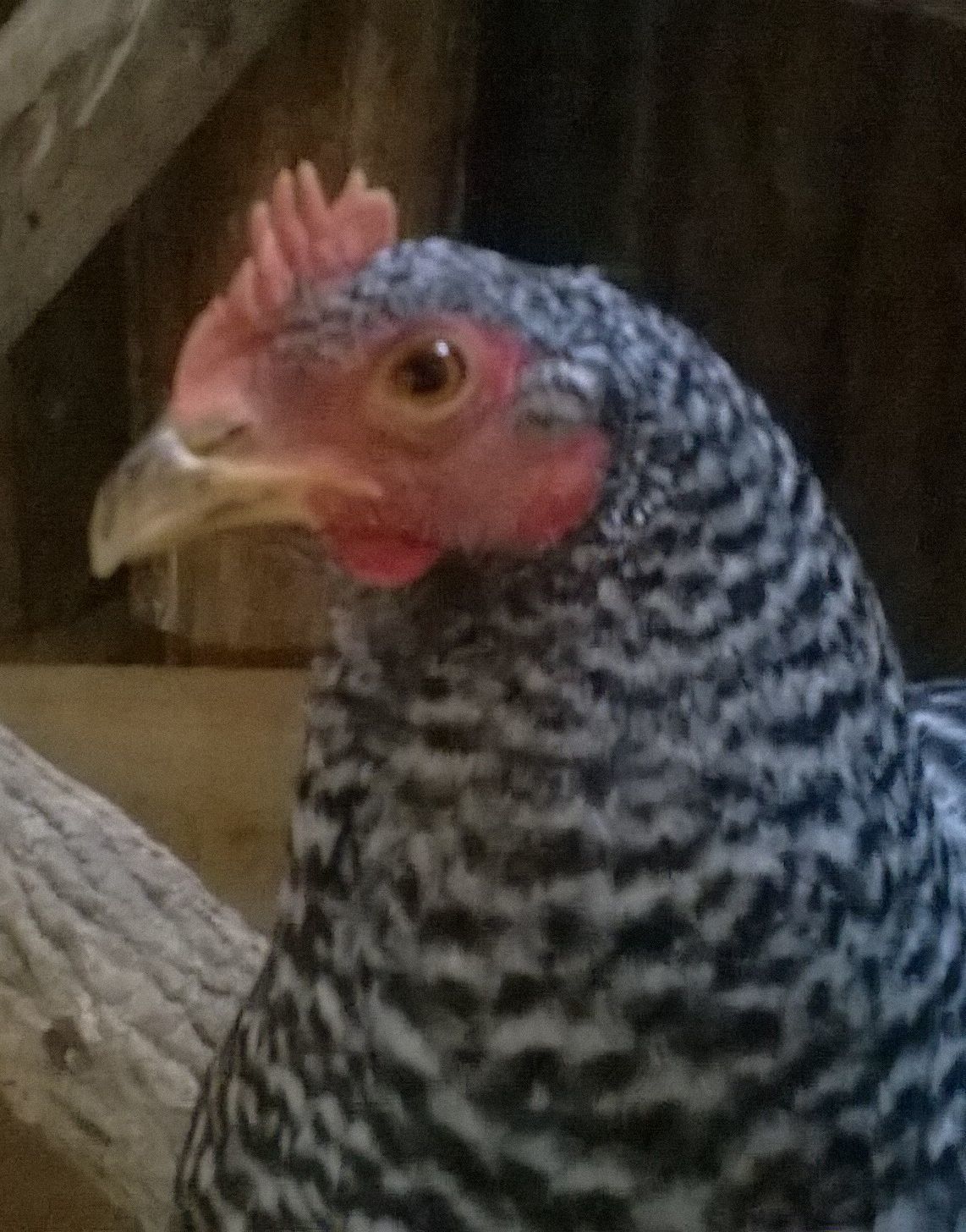 My Impression of this hen is great body type but the barring looks almost like black laced and not barred on the body. That may not make sense and that could be a problem with the photo and lighting too.
