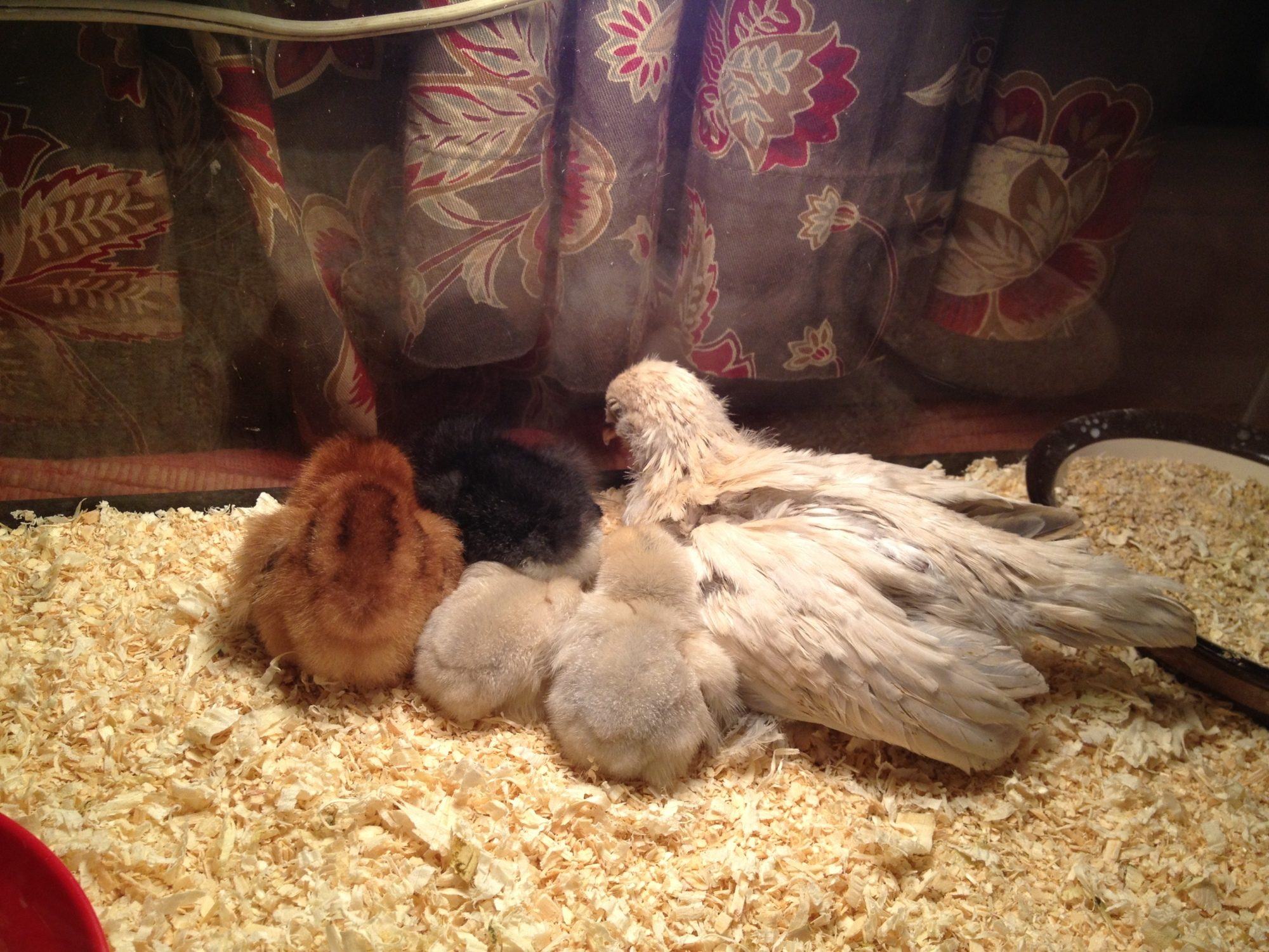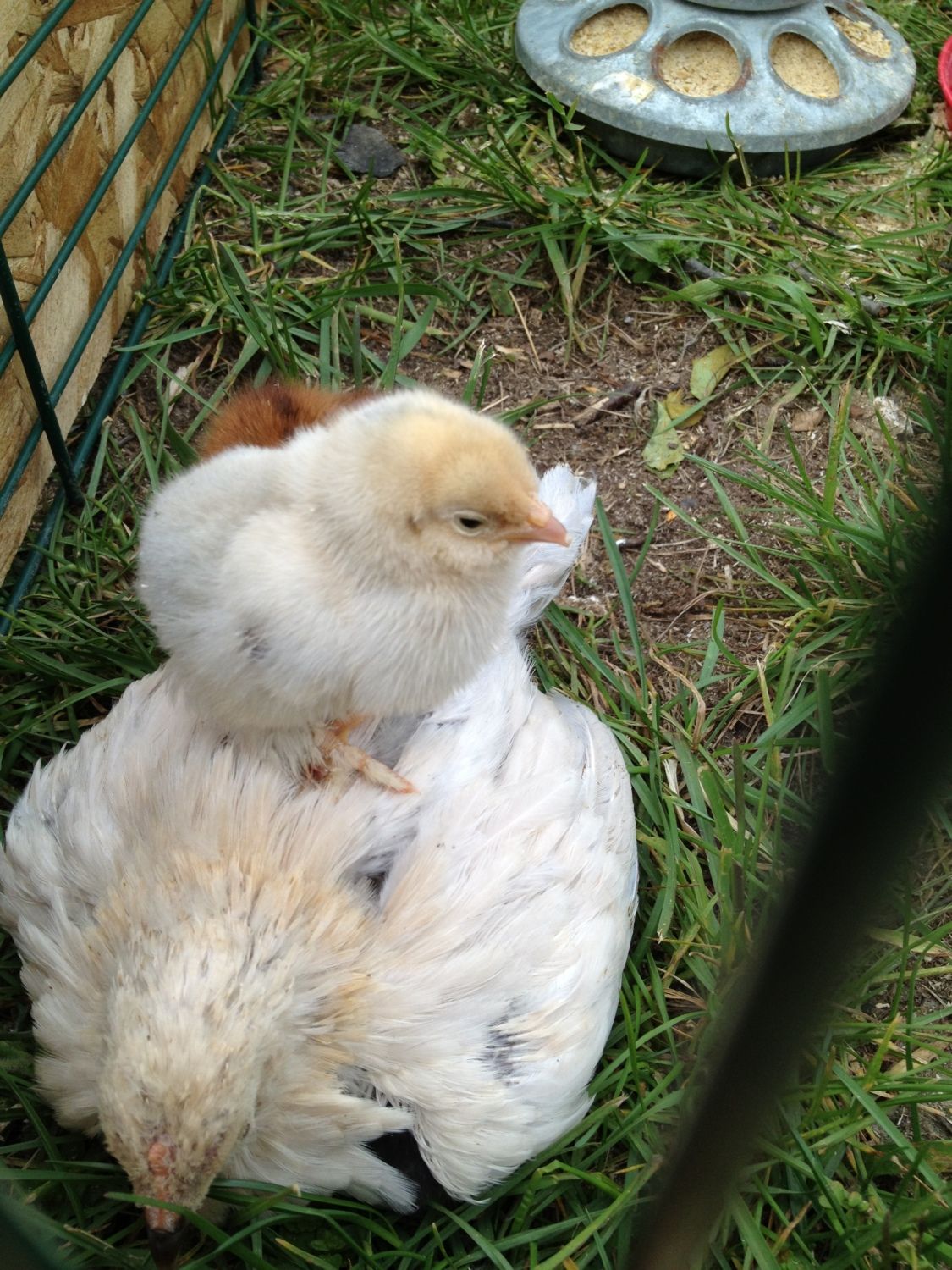 This is a very common scene...Waffles with babies under her wings and one on her back. haha