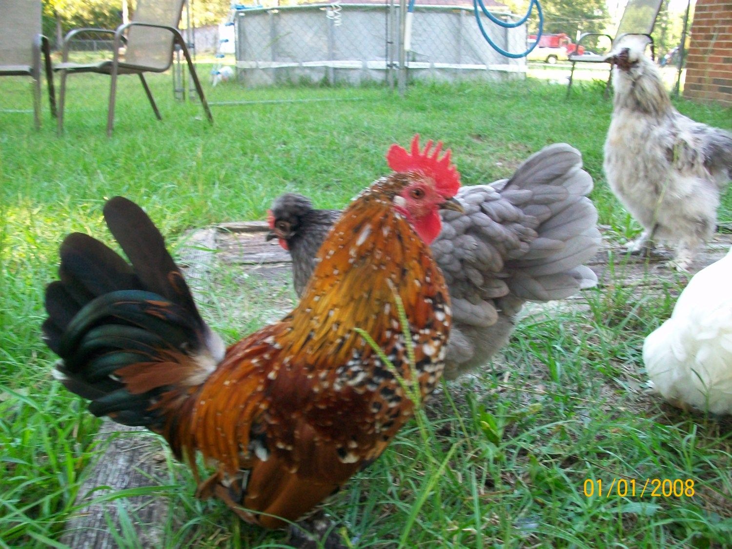 We had a silkie rooster and he was LOUD for his size. And he alarmed every time someone ran on the road by our house or the neighbor kids were out. So we have had a new d'uccle rooster for about a month and he is pretty shy still, but comes out and walks around with the other birds and then goes back to his safe spot. He is about 5-6 months old.