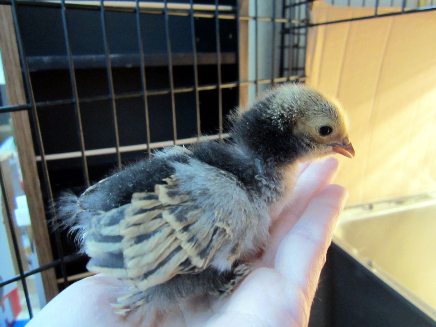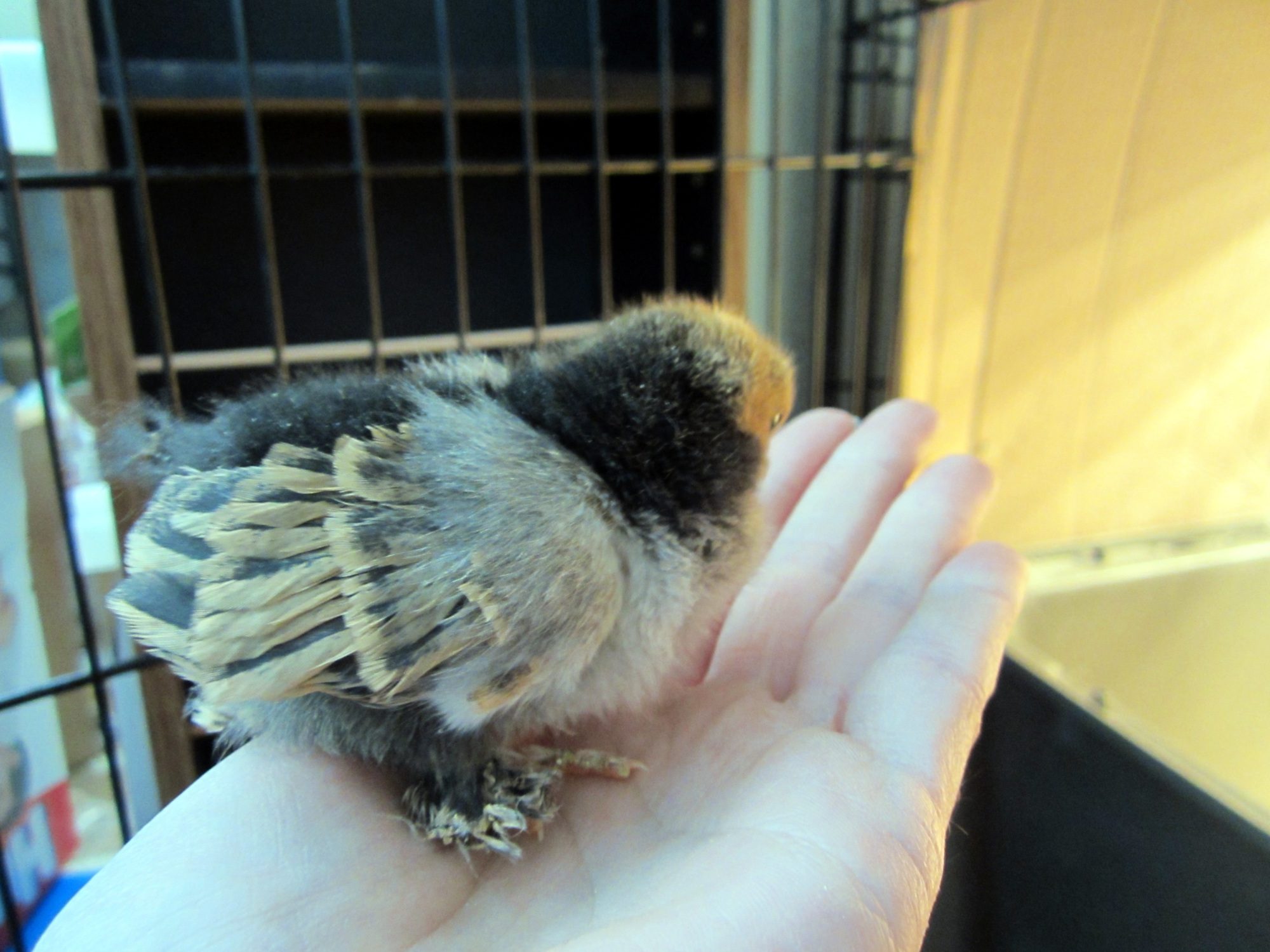 I really do like the white/black one. That will defintiely be very unique when it matures:) Keep us updated with that little one! The black one didnt have too many feathers on its feet but more may come as it ages...