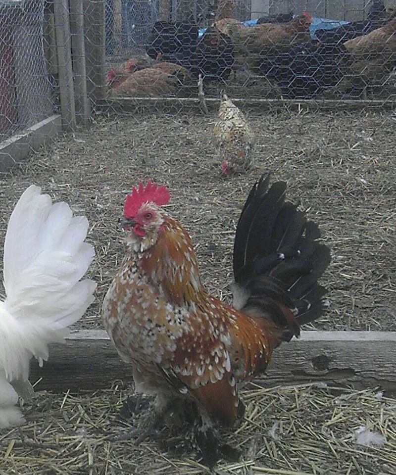 Lady JAi, the two white roos are booted bantams, a close relative of Belgian D'Uccles. You can tell by the addition of large wattles and no beards (booted). D'uccles have little to no wattles and beards with ear tuffs.