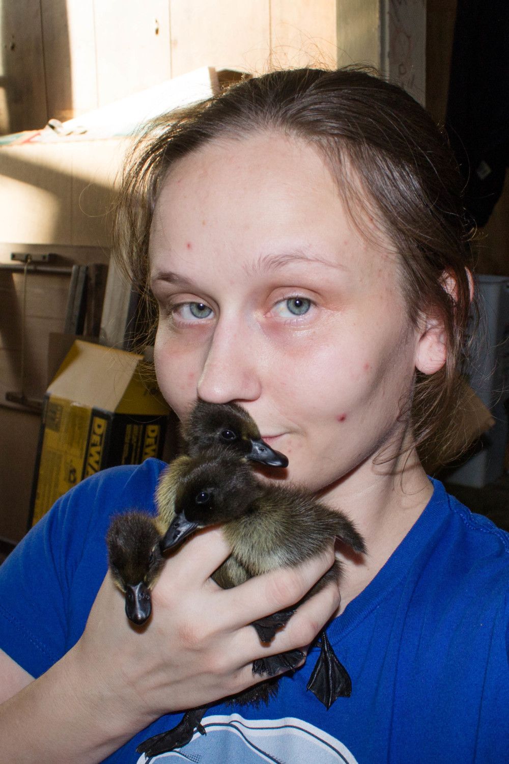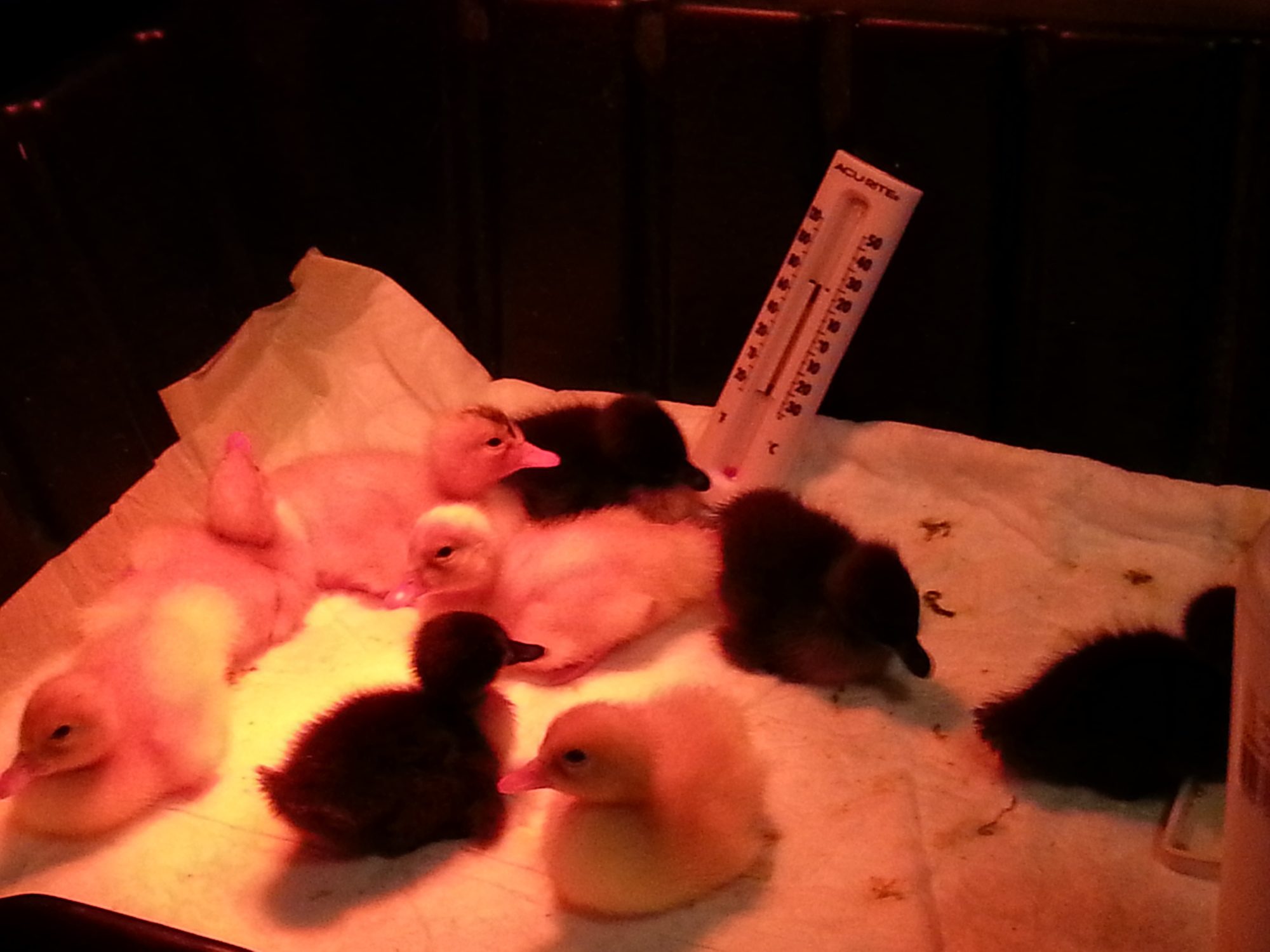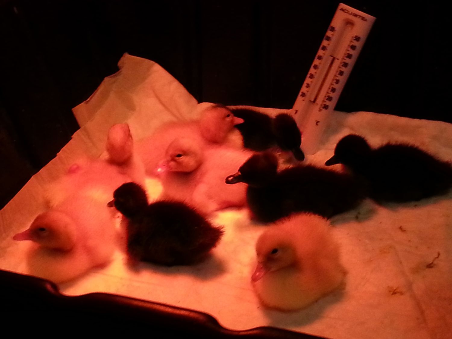 Not a very good picture of the ducklings, I'll try to get a better one. Mine are the four black ones (2 Cayuga and 2 Blue Swedish) and the Pekin in the back left with the smudge on her head. The other 4 Pekins are a friend's that I picked up for him since I was going to Ideal Hatchery to pick up mine.