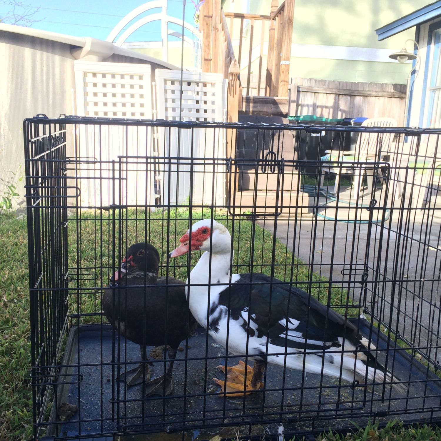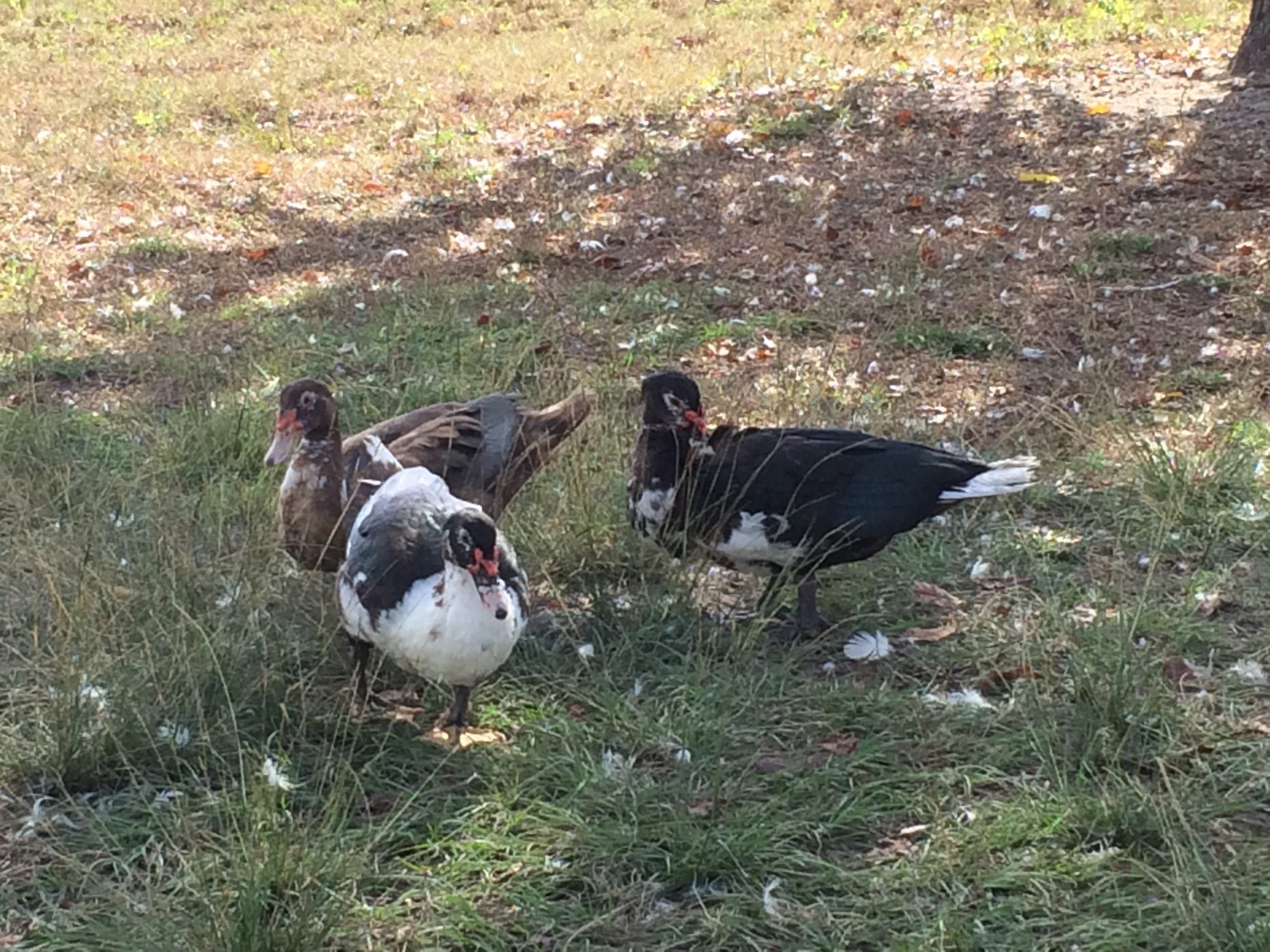 Florida Fish and Game isn't too fond of Muscovy. There are feral/wild flocks popping up all over the place. So, when a couple wild Muscovy wandered into my parents back yard(large neighborhood in Orlando) I caught and relocated them. They now reside around a semi-wild pond on my F-I-L's property. It is still in the heart of Orlando, except it is a fully fenced overgrown wildish space.
