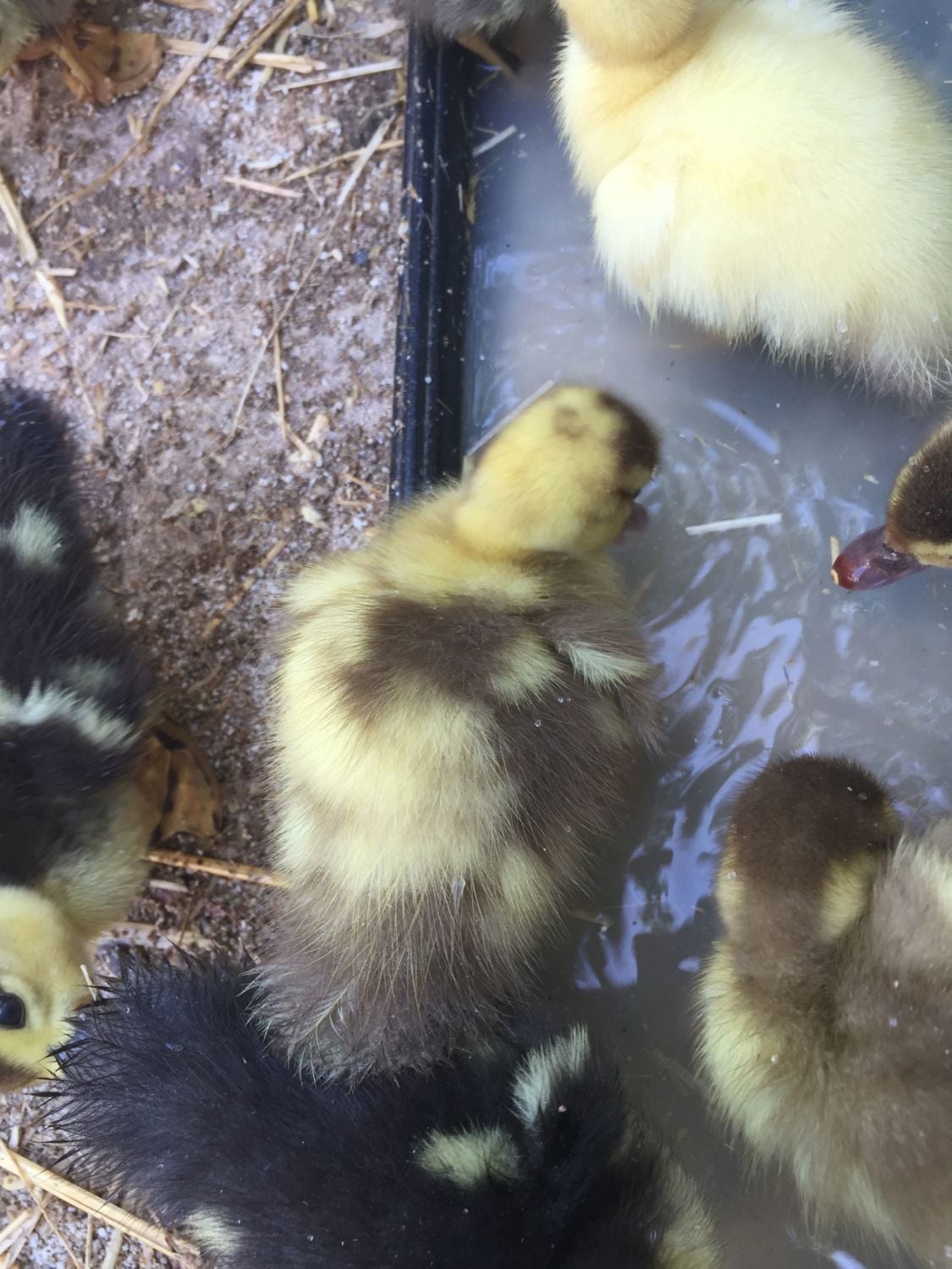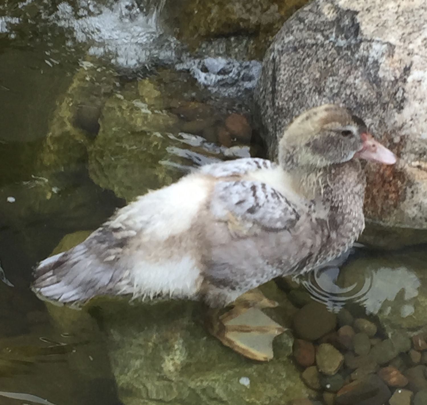 My strange duckling. This duckling was born with a mottled brown and yellow down pattern. The yellow areas are feathering in a dark brown barred (brown and white striping on the individual feathers)and the brown areas are coming in lilac. The dark stripe in the tail used to be a very small section of tipped yellow. I think it's a type of genetic mutant. Incomplete barred or a type of chimera. Chimera in that it started out as two ducklings that fused into one, a lilac and a brown barred. The crop is extremely full in the last picture, the duckling had just gorged itself on watermelon. This was one of only a few ducklings I got from Nutmeg my brown barred hen who passed from egg laying issues. She was in her first season of laying. Her eggs kept coming out odd looking, large, small, long, misshapen and whithout a shell. I thought it was just taking her longer to get into the egg laying groove. I noticed what looked like scrambled eggs mixed in with poop and that she seemed under the weather. Warm water soaks, nutradrench and antibiotics seemed to be doing the trick. Than she took a drastic turn for the worst, went down hill rapidly and was gone.