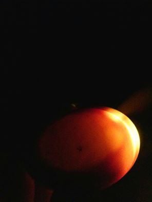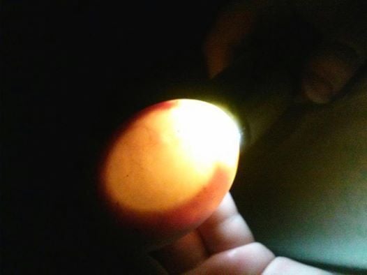 The eggshell changed from white to green over the last few days. When we candle it we see stuff floating around, but we don't know what it is. This is the first egg from my post titled Gunk in Duck Egg.