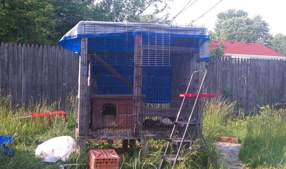 Back and Front are made from dog kennel panels, top is tarped to give shade and keep most of it dry. I have a ramp propped up with milk crates and I have a fence circled around it to keep them in. Works great for my six week old ducks.