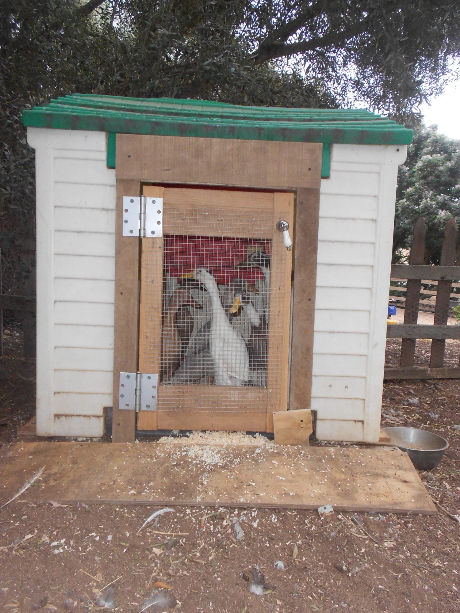 here is our set up for the ducks.i used to let them run the property but i could not keep the waterers full for the chickens so we fenced them in.it is a big space for them with trees,dirt and a pool.