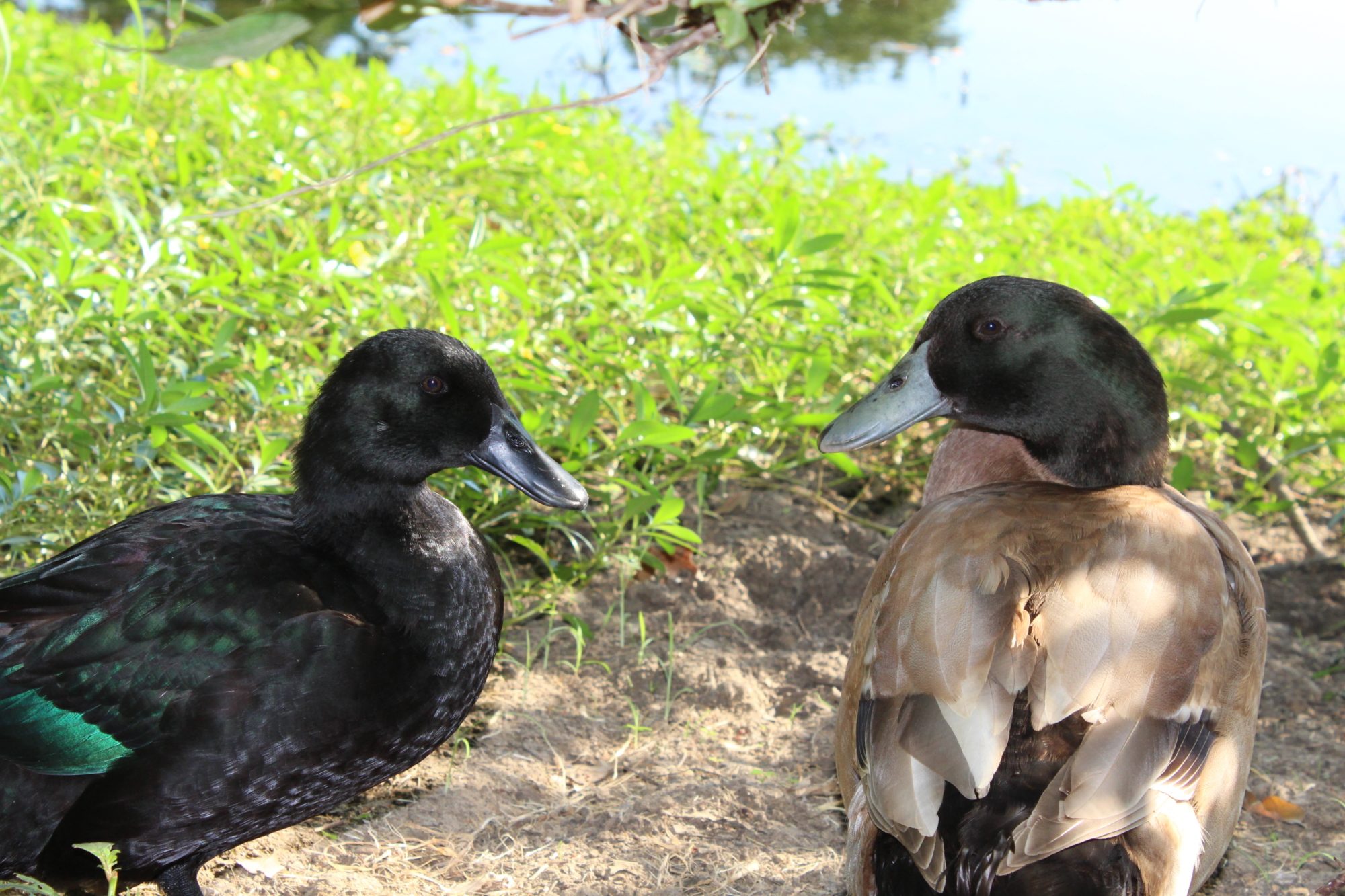 Hello guys! I just took the new puppy to a local pond/wooded/field area, and there were a pair of ducks there! One looks, to me, like a Cayuga hen, but the drake is stumping me. I swear I've seen one before, but I can't quite put my finger on it... It has been a while since I looked up anything duck related.
