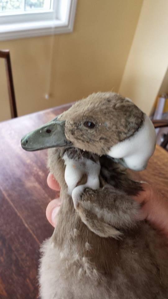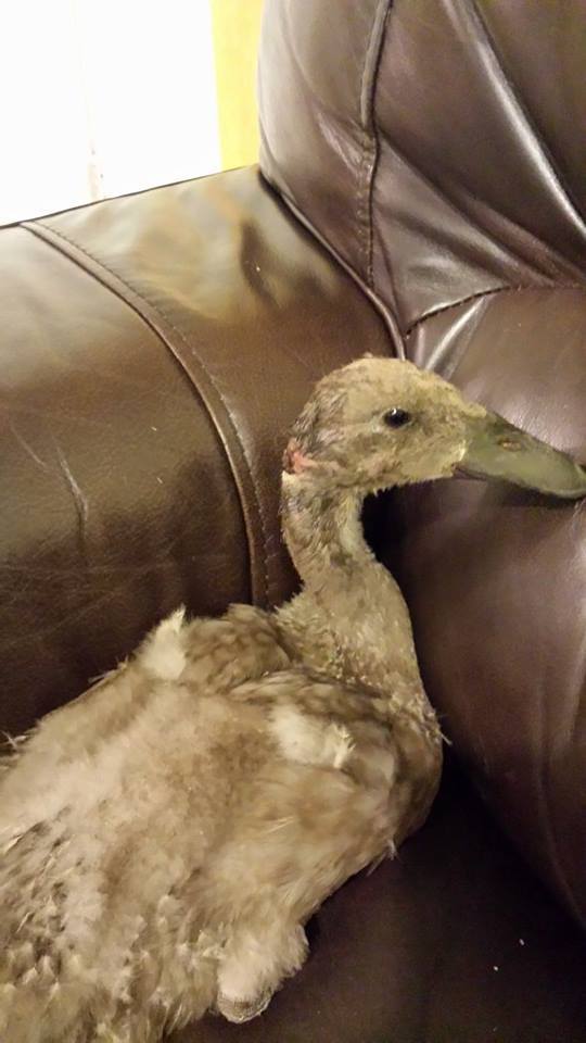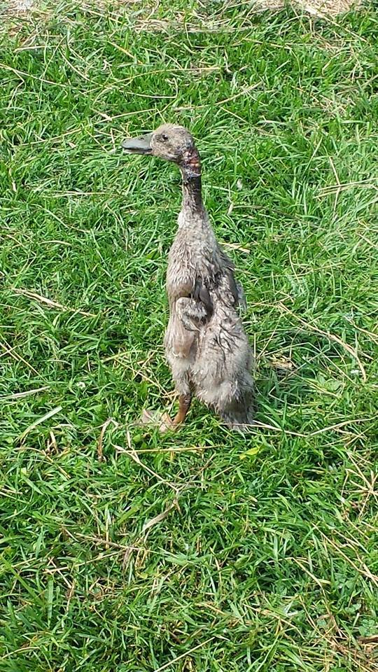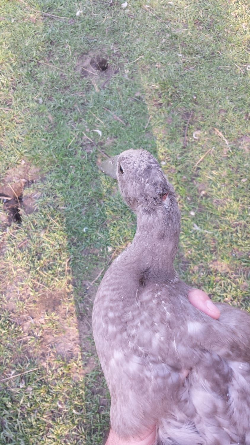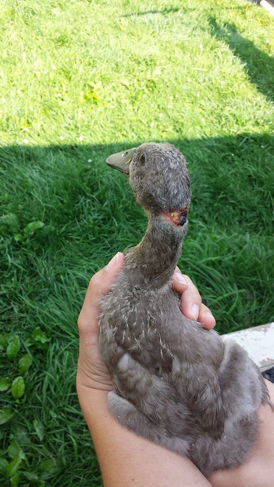 Our poor little duck came to us from another farm after being attacked by a Norway rat at roughly 4-5 weeks of age.