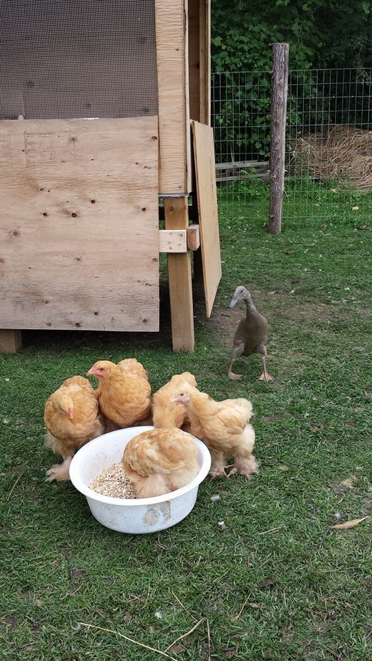Day 13-14 - he is back out with his chicken friends regardless of our many attempts of re-uniting him with his duck 'buddies'. He seems to naturally flock to the much less aggressive chickens. Our 2 flocks may be intimidating since we have 50+ currently.