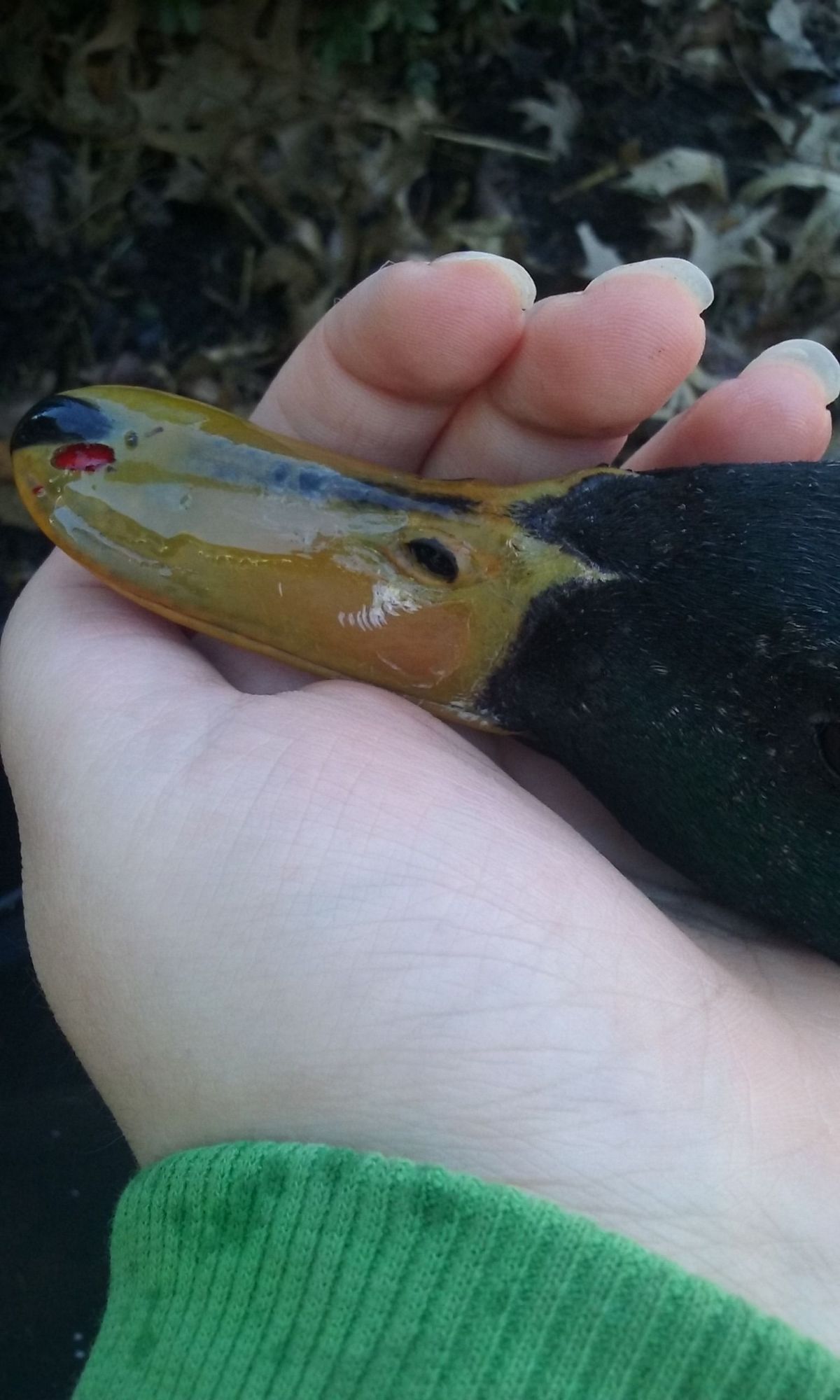 I have a mallard drake that recently sprained his leg so his been staying in his coop to heal. But I went outside to find blood on his hay and his bill bleeding. His coop has chain-link on the outside and chicken wire on behind it(it's for chicks but he needed a coop) so I think he may have gotten it caught on the chicken wire and scraped it. It doesn't look that very serious and he's acting normal but I'm still worried about it. It's that red spot on his bill. Please tell me what I should do about it.