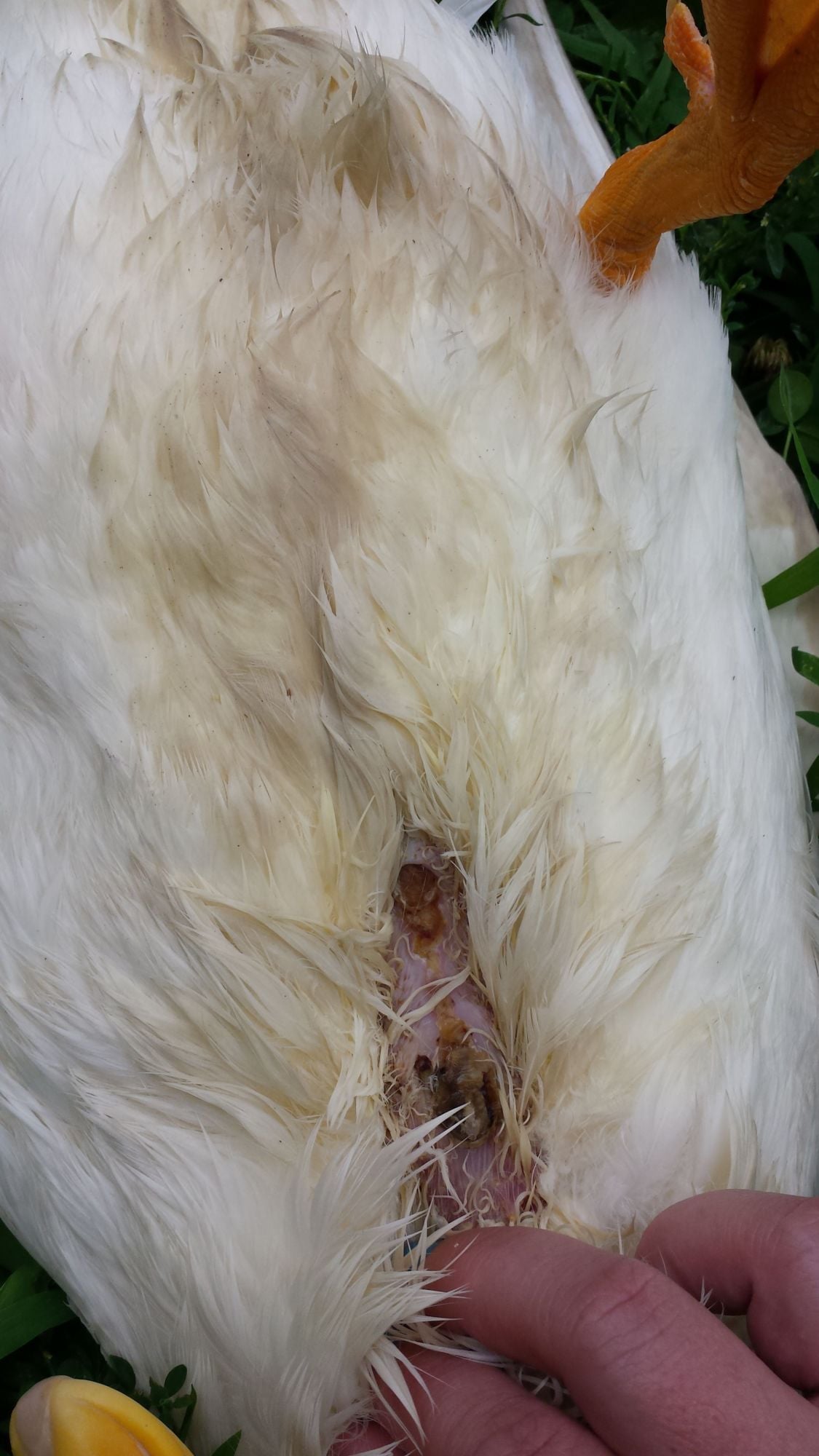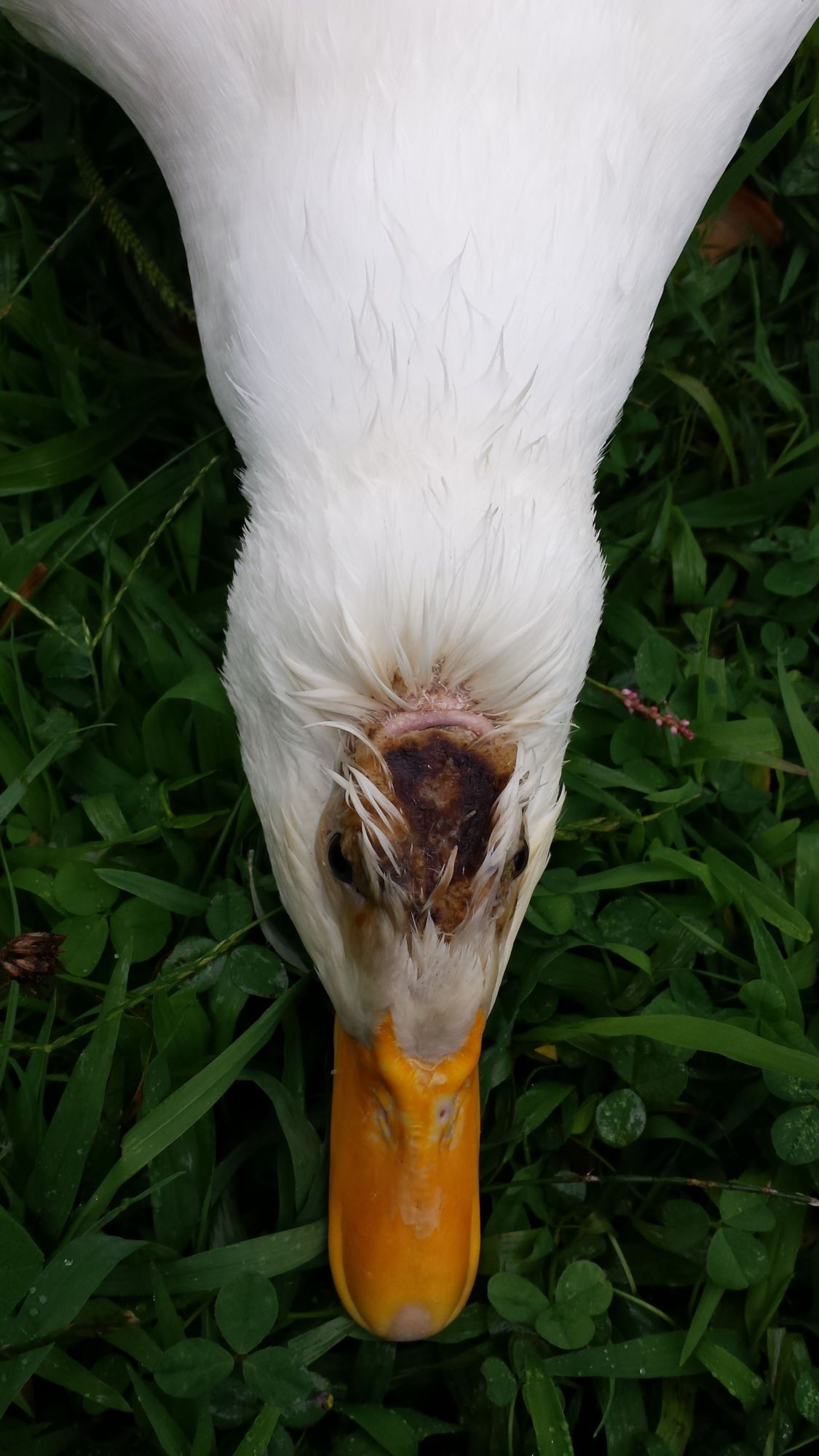 So, I was given this duck. The old owner said it just started acting funny, falling down when walking, etc. I noticed the head wound the same day I got him - I'm assuming the other birds he grew up with had been picking on him - and I've separated him from the rest of the flock and have been giving him daily baths and feeding him the rickets diet, thinking it was a combo of rickets and pain from the head injury.