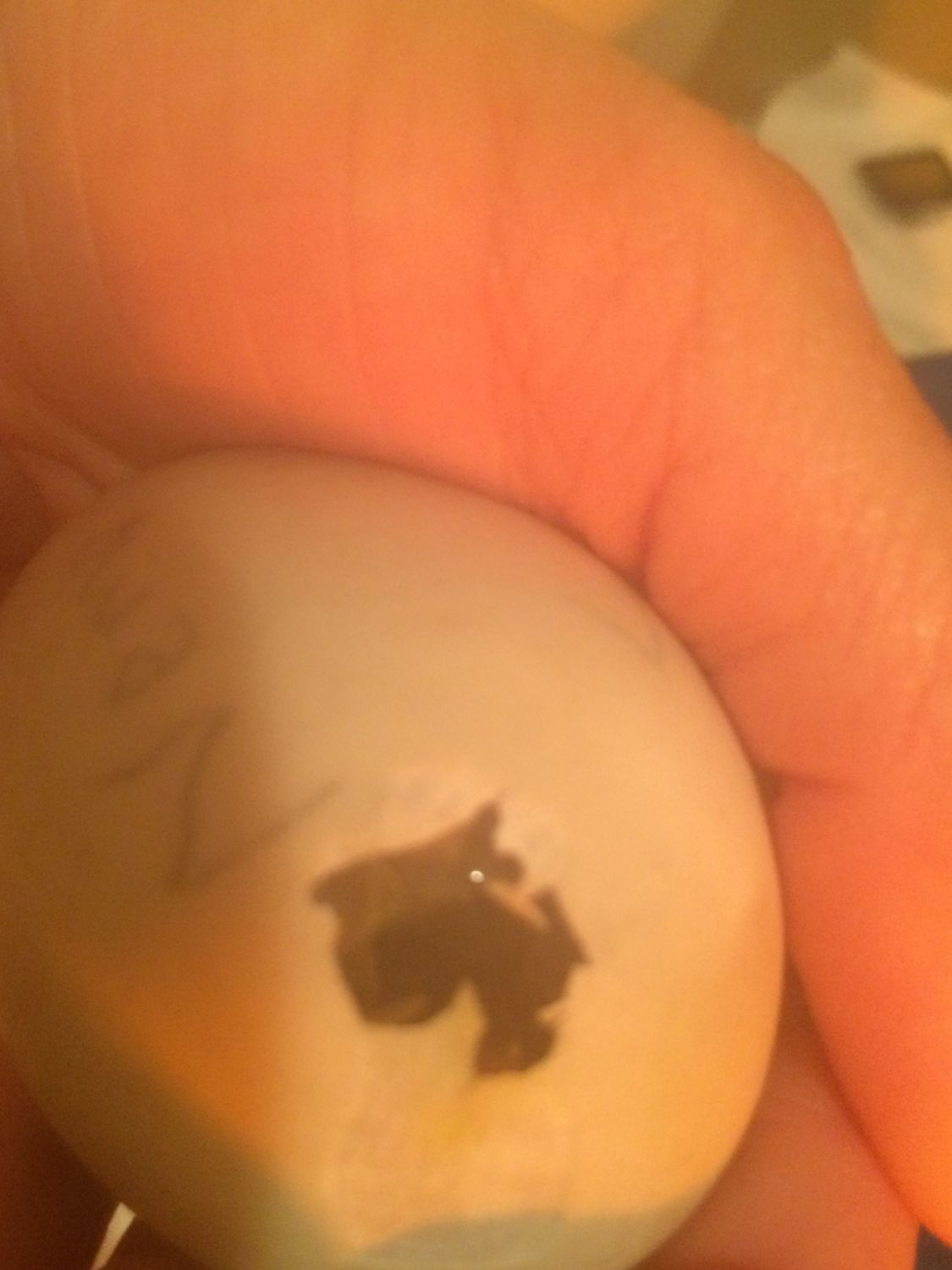 I got this pic, but it's hard to really tell. I turned on the shower and heater in the bathroom to the point I was covered in condensation (actually probably sweat), so I could take him out of the bator. I think I am looking at the inner membrane. His beak is definitely out of it, but it looks like the rest is around his body and at least partially pulled away from the shell. I could fit a moistened qtip between it and the shell. I moistened this and the white membrane around the opening with a warm wet qtip. He is still breathing, no peeping right now. Also the whit membrane is turning a light yellow around the edges