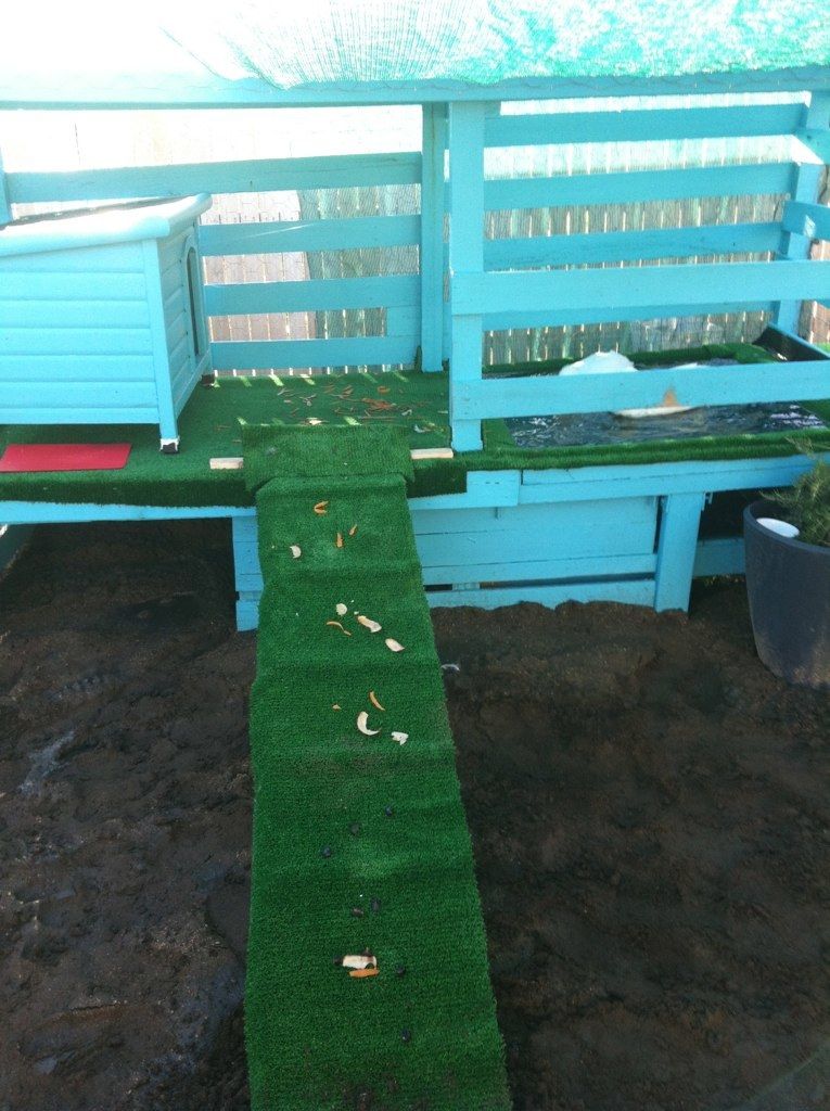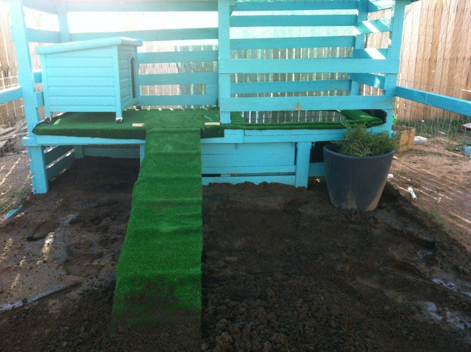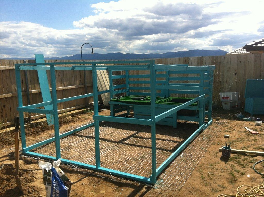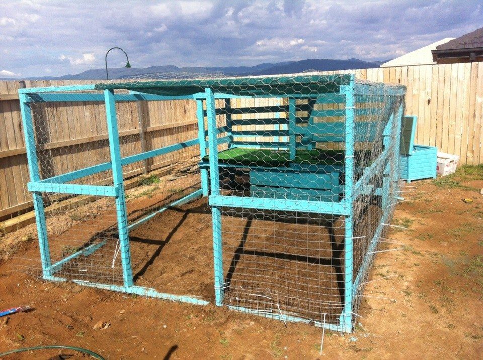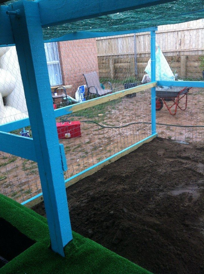 What are your plans for stopping them digging in through the bottom of the 'outdoor' run (the bit you built beforehand)? Options are flooring the whole thing in mesh (I use welded mesh panels) or having a skirt of mesh laid out on the ground around the perimeter and buried a bit (at least 40cm out form the pen). Covering the floor is by far the safest. I've used 75mm x 50mm mesh panels (from MetalMart).