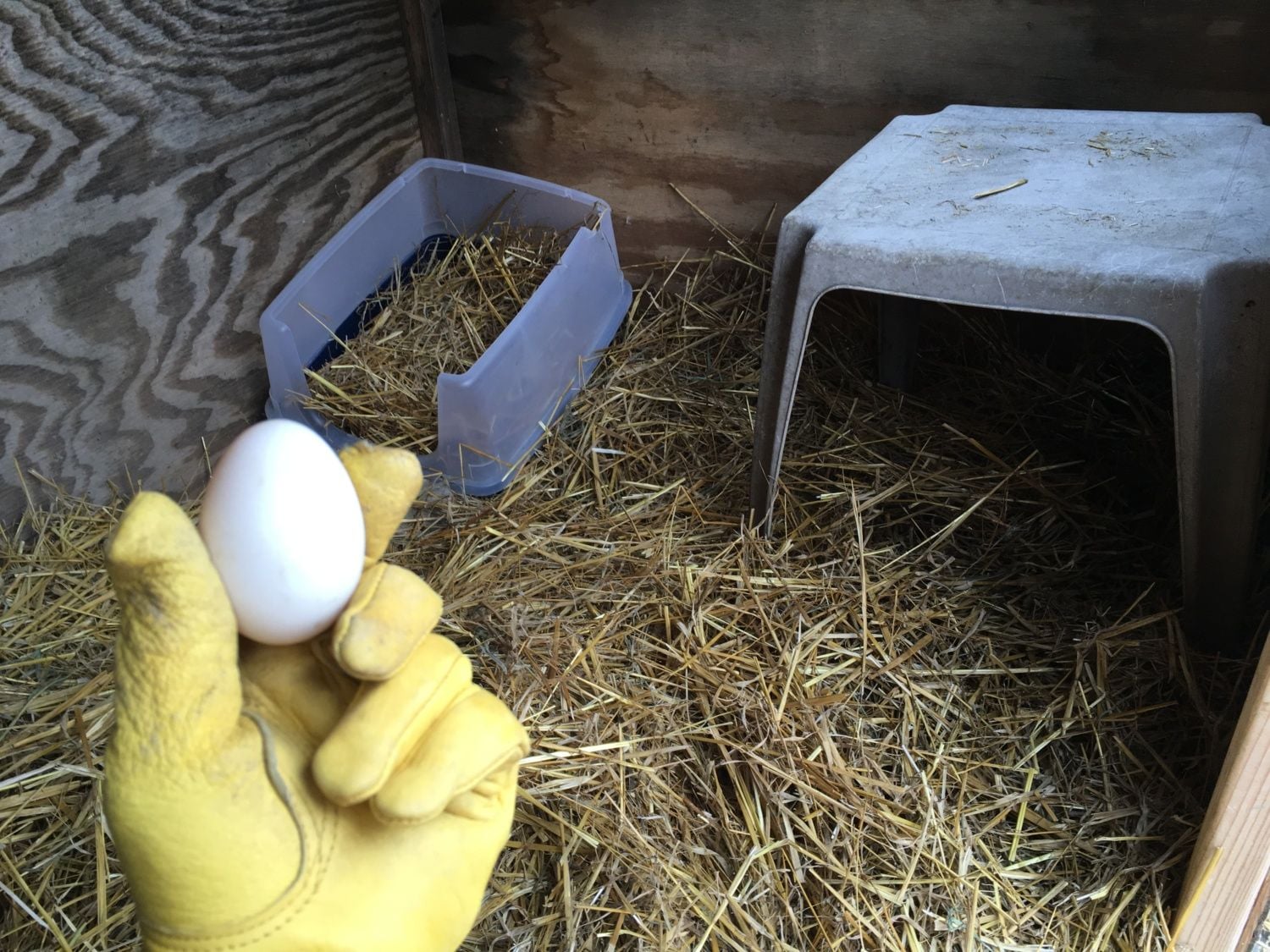 From what I had read, ducks need encouragement to lay in a nest so I asked some friends to make me some wooden dummy eggs that I put in litter boxes (new Iris ones purchased from Amazon) and that ducks usually lay in the morning, so we wouldn't let the ducks out of their house until 8:30ish.