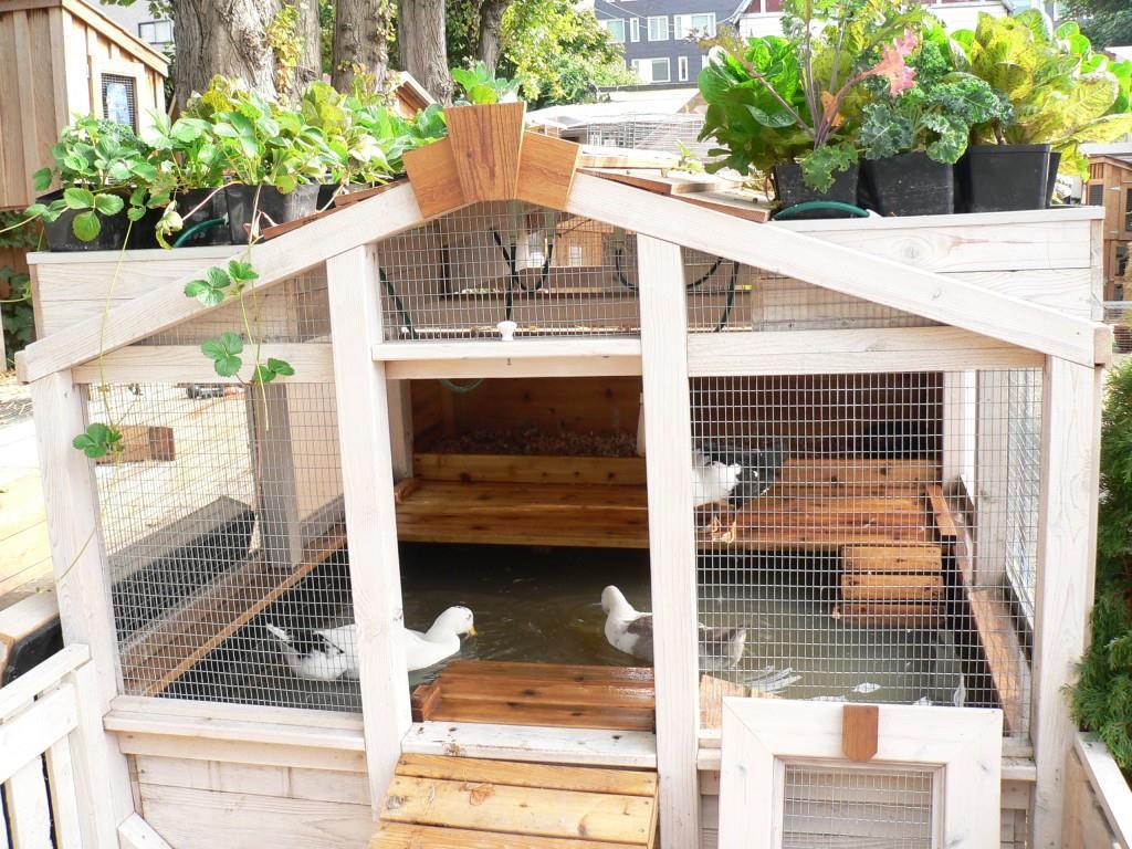 I have chosen to get 2 drake call ducks for multiple reasons. ( noise level &size). We are constructing a duck pen yard . It will be a duckponics system I am including image below. They will have an enclosed raised wire floor pen in the rear of the duck house/pool area(not shown). But I am going to have a small yard area in front where door ramp drops.
