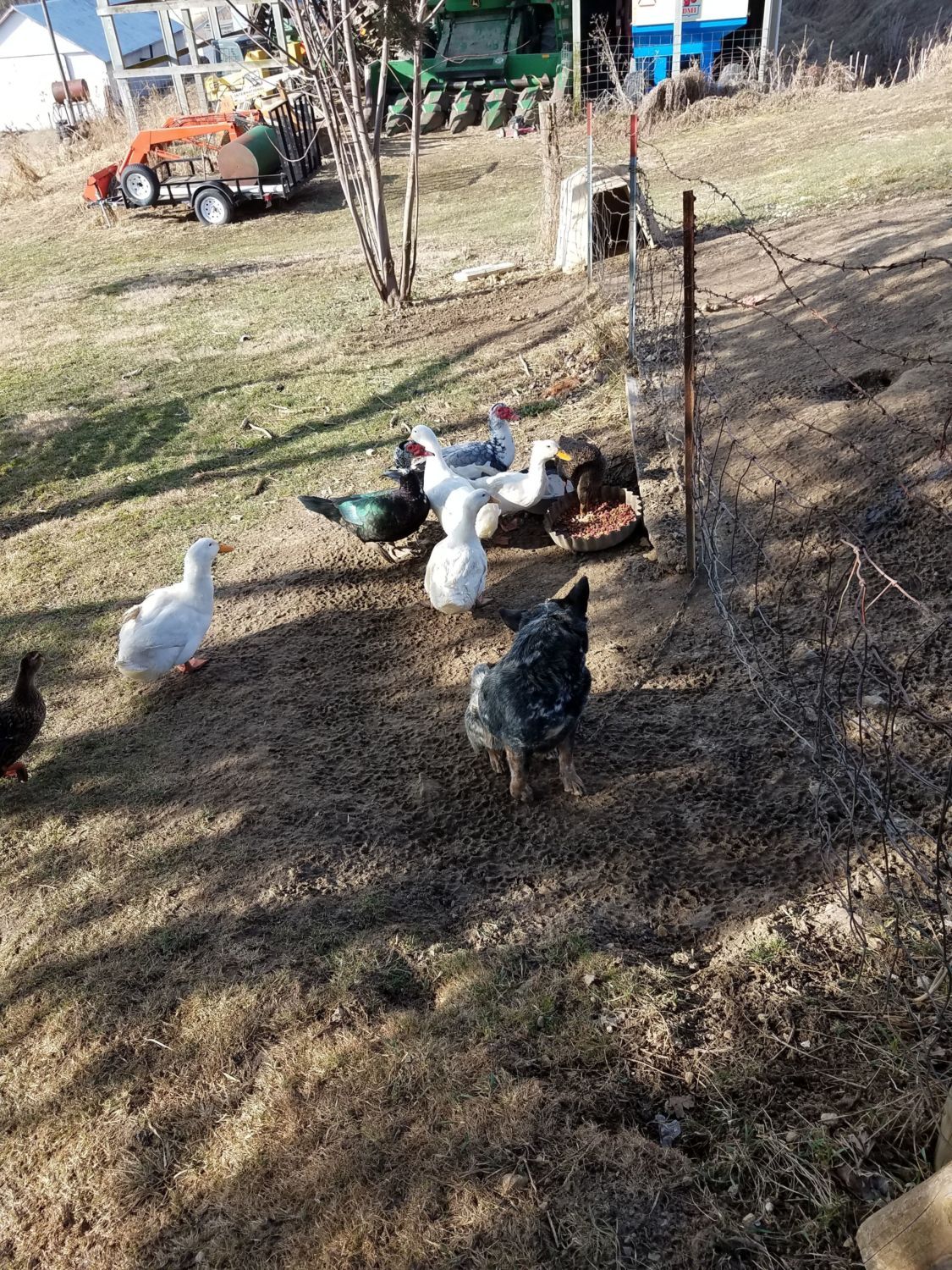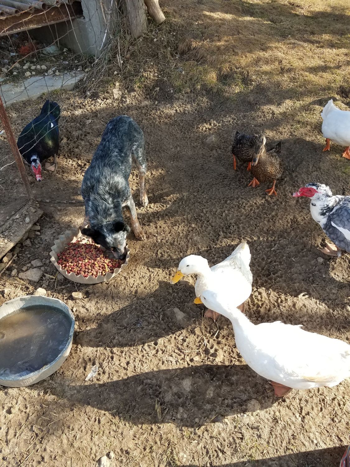 I have some weird birds. I have a turkey sitting on duck eggs and I have ducks who wait by the dogs food bowl for me to feed the dog. They go nuts for dog food. It's so funny watching them try to sneak the food behind the dogs back. Even though the dog will just watch them eat it.