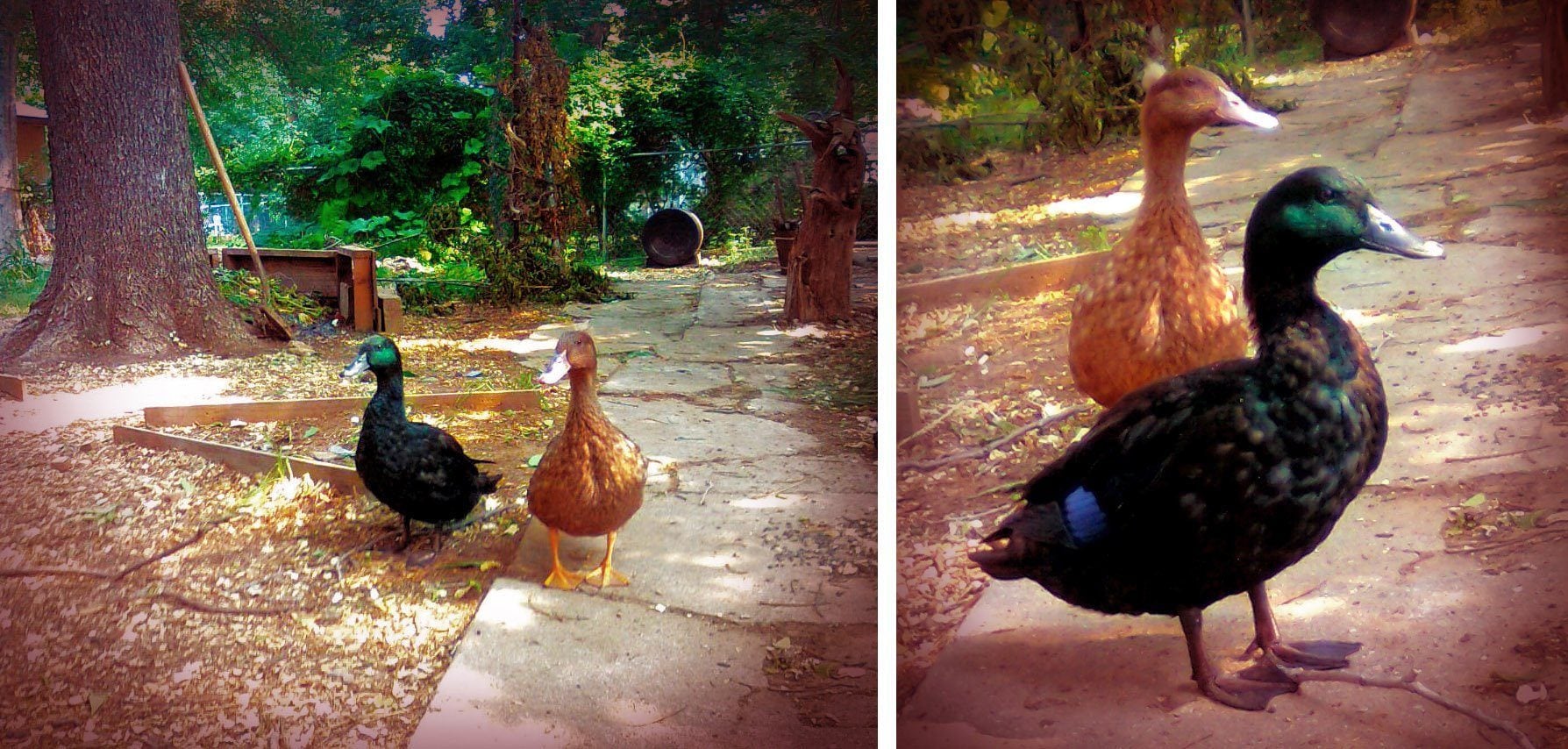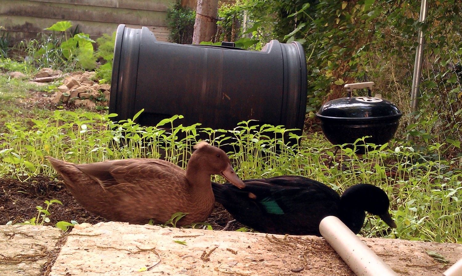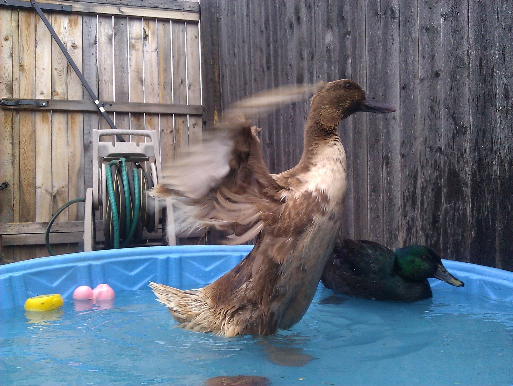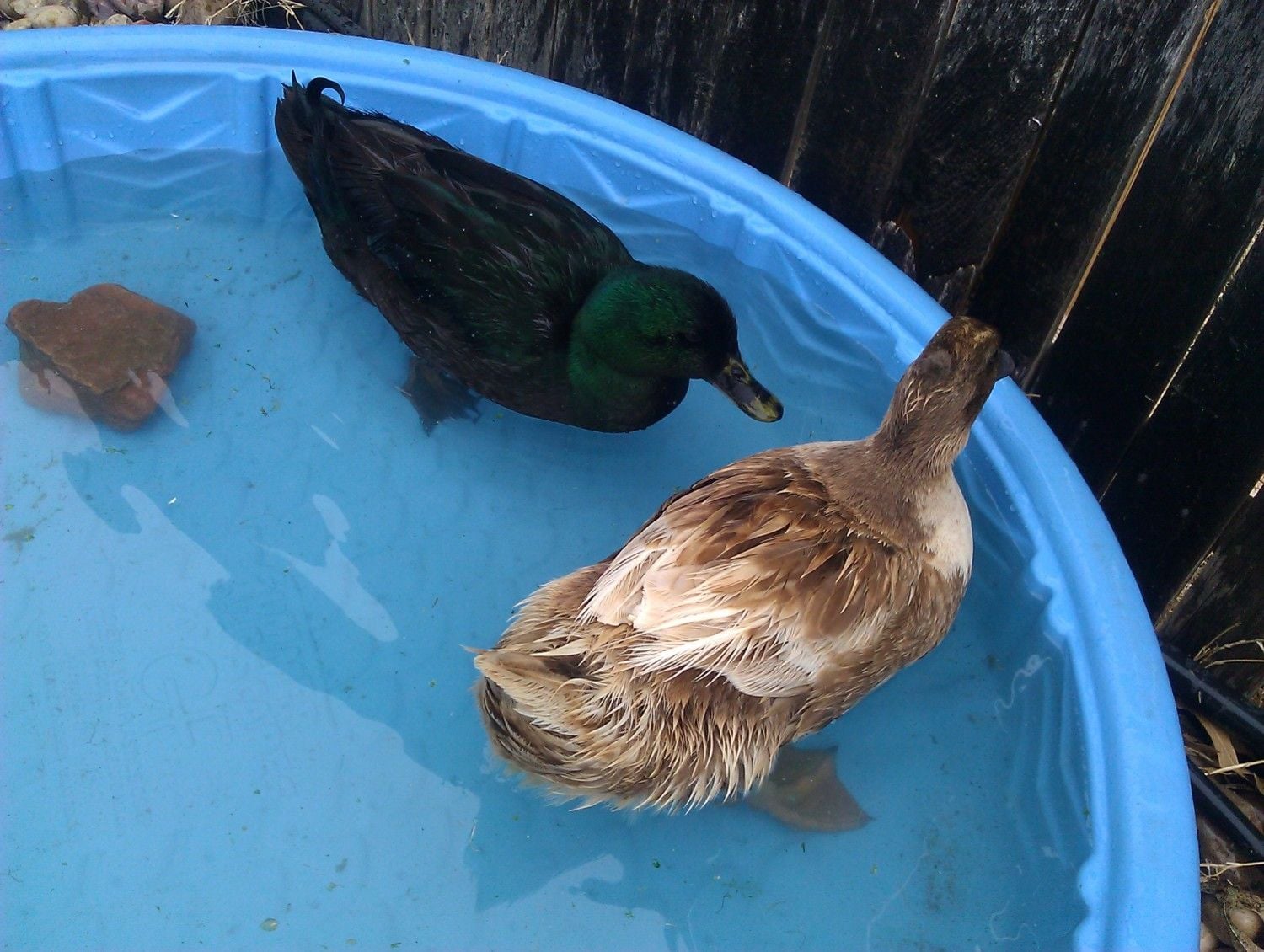 Other details that may be useful: My mother had to put straw in the enclosure for the winter due to severely cold nights, and the enclosure is kept very clean/straw replaced at least once a week. The ducks are allowed to free range the yard during the day, have a nice kiddie pool to play in with clean water every other day, eat pellets for ducks mixed with grit, have free range oyster shell and black oil sunflower seeds, and get to forage in the compost for bugs/worms. They also get plenty of vegetation from the yard as well as greens from the kitchen occasionally.