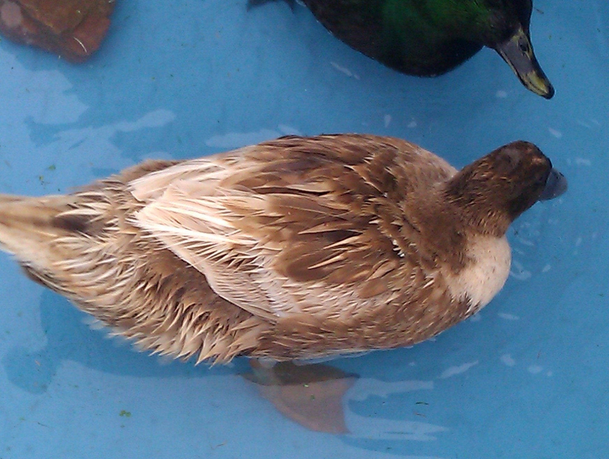 I have two 1-year old ducks, one a drake (black with green sheen, thought he was a cayuga, but too small; he also seems to be too big to be an east indie, so i'm guessing he's a mix of something) and a khaki campbell female. I had them for about 4 months before I had to relocate from Oklahoma to Oregon, and unfortunately could not take them with me. I left them with my parents after building a secure enclosure at their house. I have come to visit several times and am concerned for my female (the campbell). Her feathers have started to fade drastically, and it looks as if many of her big wing feathers are sparsely covered. She lays about an egg a day, and the eggs aren't overly bumpy or thin, so I don't think she has a deficiency. My next guess is mites or lice? I noticed this time that the drake doesn't have as much sheen to his feathers as well. I haven't yet been able to closely examine them for mites or lice (on the agenda today) but I was wondering if anyone has any advice or insight? I think I am going to get some diatomaceous earth to worm them and spread around their enclosure; I don't want to dip them in poison. The female tends to be a bit anxious, and I'm wondering if the drake is too much for her/stressing her out? Maybe there needs to be a few more females? I haven't noticed excessive preening or indication of itchiness, but then again I haven't been here.