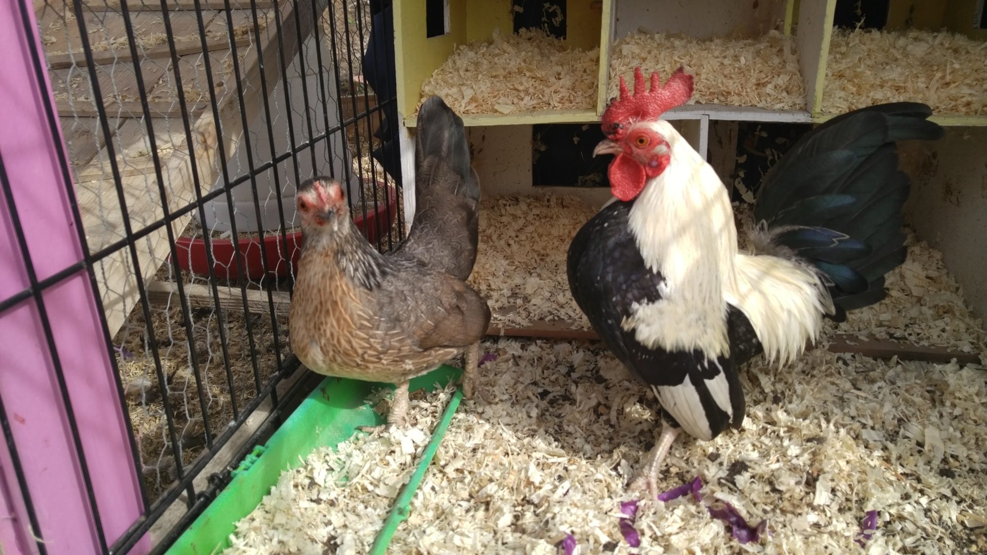 They appear to be Old English Game Bantams. For sure, the rooster is an Old English Game (or a mix of that breed) since he lacks the white earlobes, slate legs, and body type of Dutch Bantams. I can't see the earlobes on the hen but her coloring and leg color aren't quite right to be a purebred Dutch Bantam.