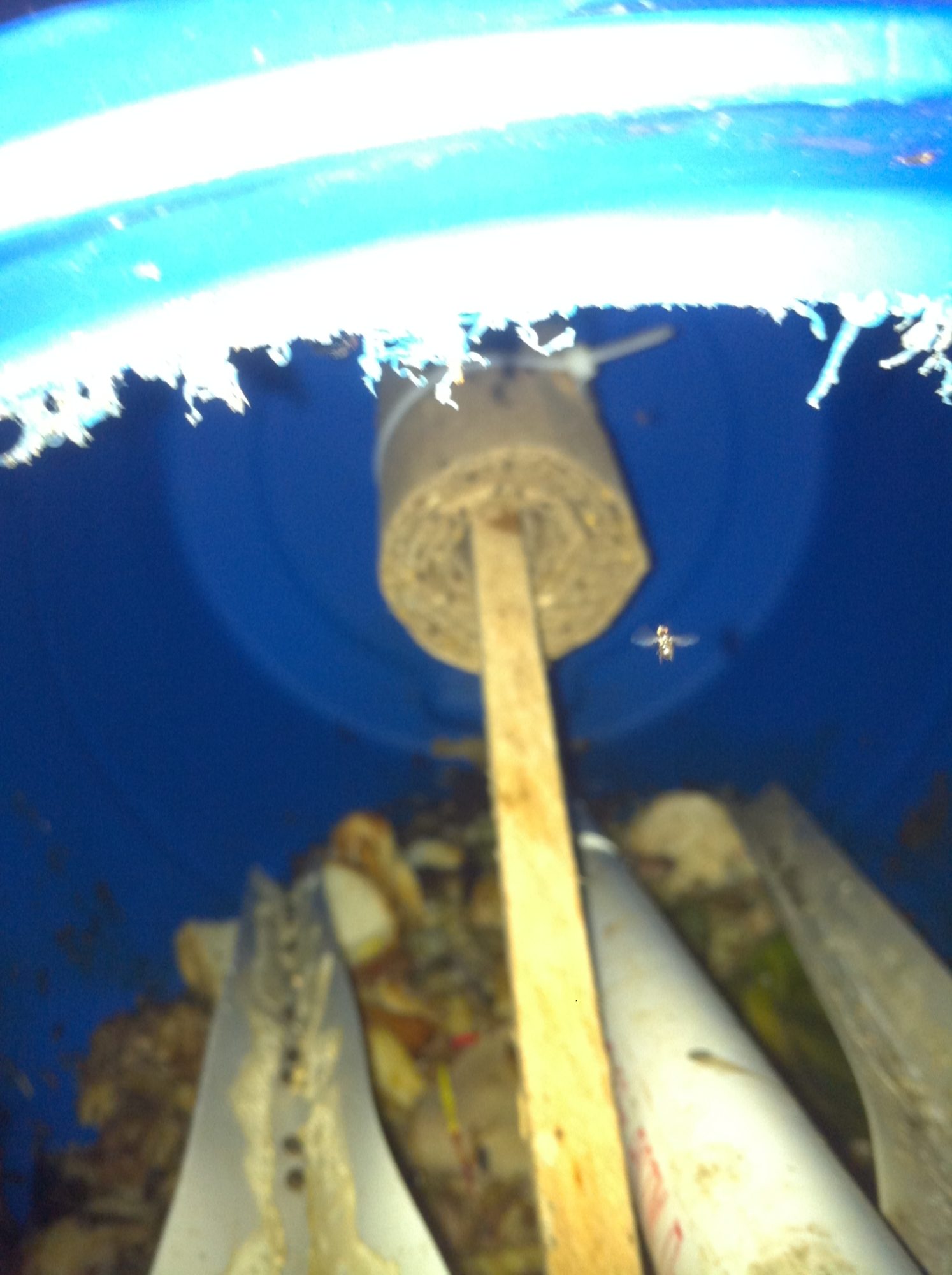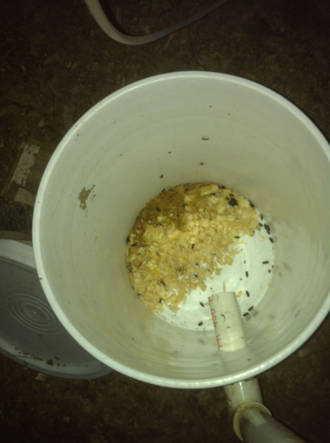 I used this 30 gallon Drum for my Bio pod for BSF and put a piece of 2 in pcv in for the ramp for them to crawl out when ready, i feed mine scraps that do not go to the chickens, including some scrap meats, fish, leftovers from chicken processing and even a dead chicken. No problems they will consume it all quickly. When they get to going good i will have a couple of hundred crawl into the catch bucket every day.. They come running when i have the bucket in hand. The Hanging piece is just a roll of cardboard so that the BSF females can lay eggs. You can see the young larvae on the surface and on the barrel side. This winter i covered them with scoop of manure to keep them warm, i also will throw scoops in during the summer if my scraps are scarce.
