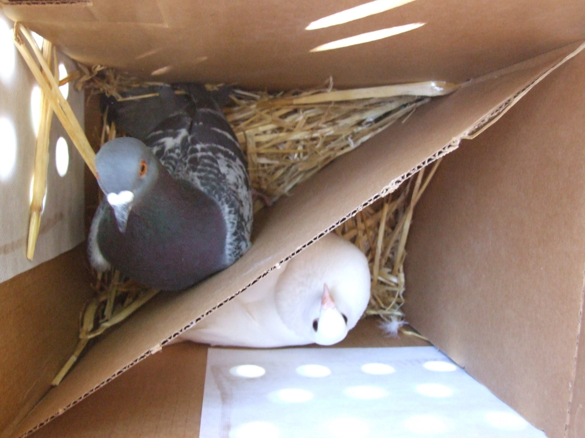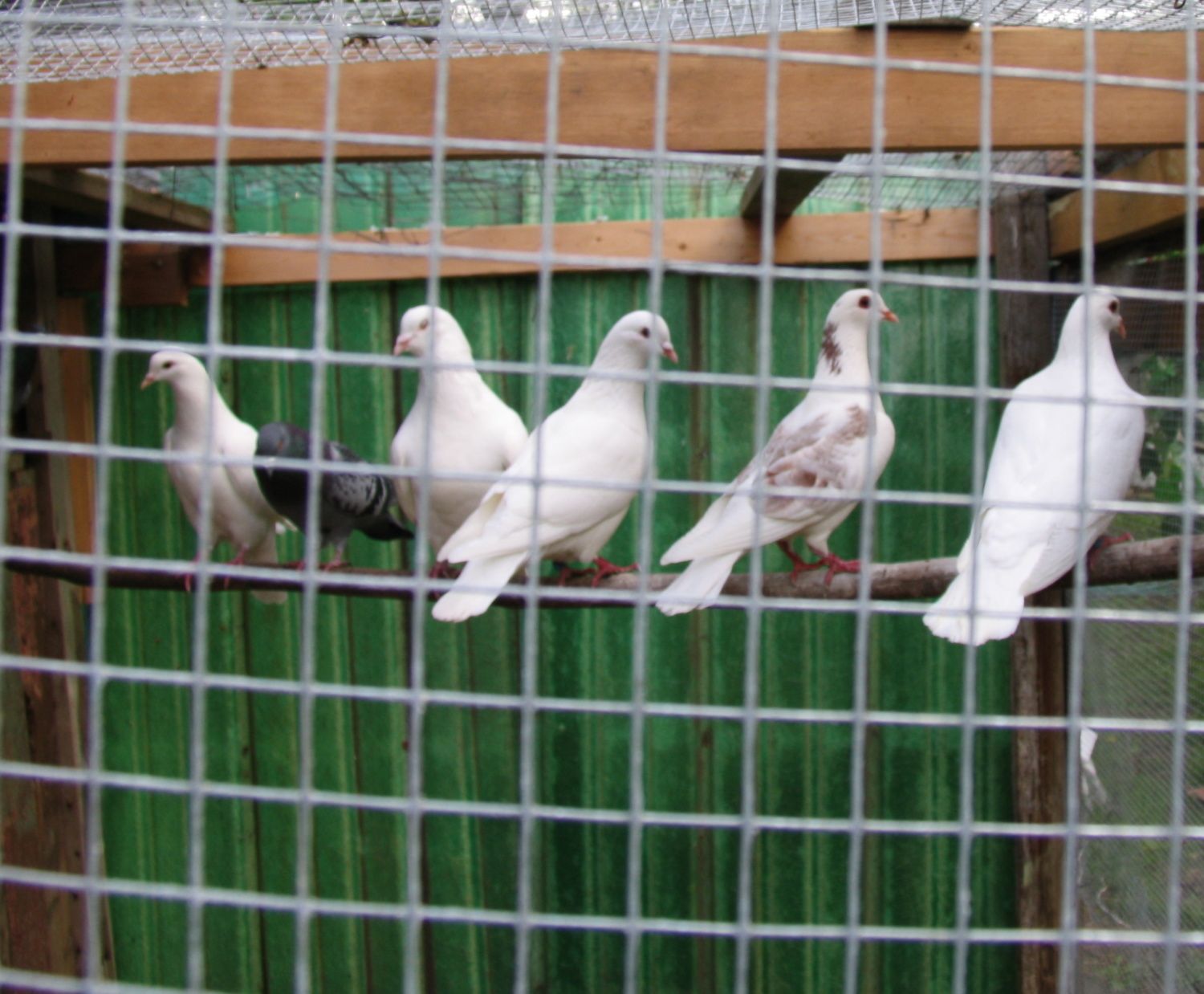 They are rescue birds that I have been waiting to adopt. Will be fun having the cooing in my back yard! Makes me wonder how many feral pigeons will end up being called to the yard due to them. After all we have an old grain elevator not far from our house (about 1/2 a block) with some pigeons. The aviary is fully enclosed to safeguard these guys. Good thing too, as I noticed I had a red-tailed hawk circling our houses today. Hopefully he/she won't be willing to try to take on the full grown ducks or large hens. May have to put some sort of anti-Hawk wiring across the hen's yard otherwise.