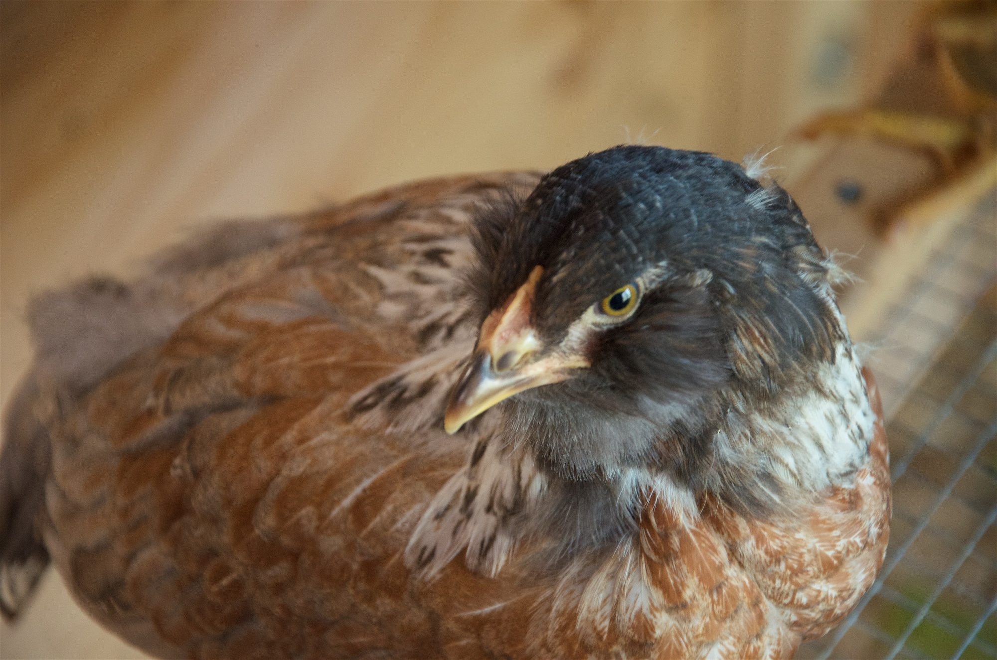 Eight week old Easter Egger, pullet or cockerel? I know the coloring suggests rooster, but she/he has no red, nor triple pea comb. She/he is at the bottom of the pecking order. Feathers are rounded, not pointed. I have looked at hundreds of photos looking for anything that looks similar, and I haven't found any bird with a black head, then the white and black, then the reddish brown on the body. What are your thoughts?