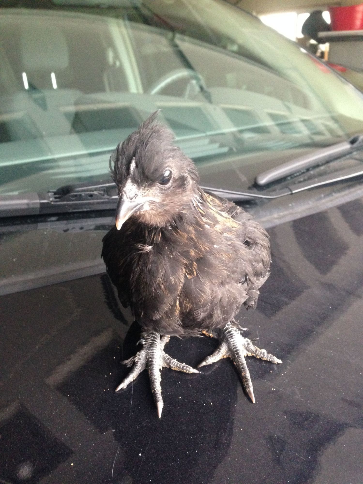 Only four toes but black skin and legs and beak and slight poof on head! Single comb.