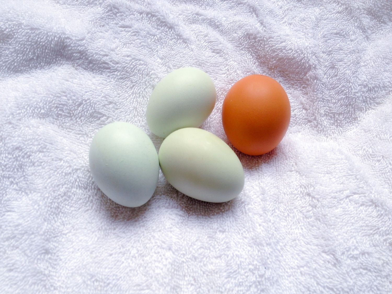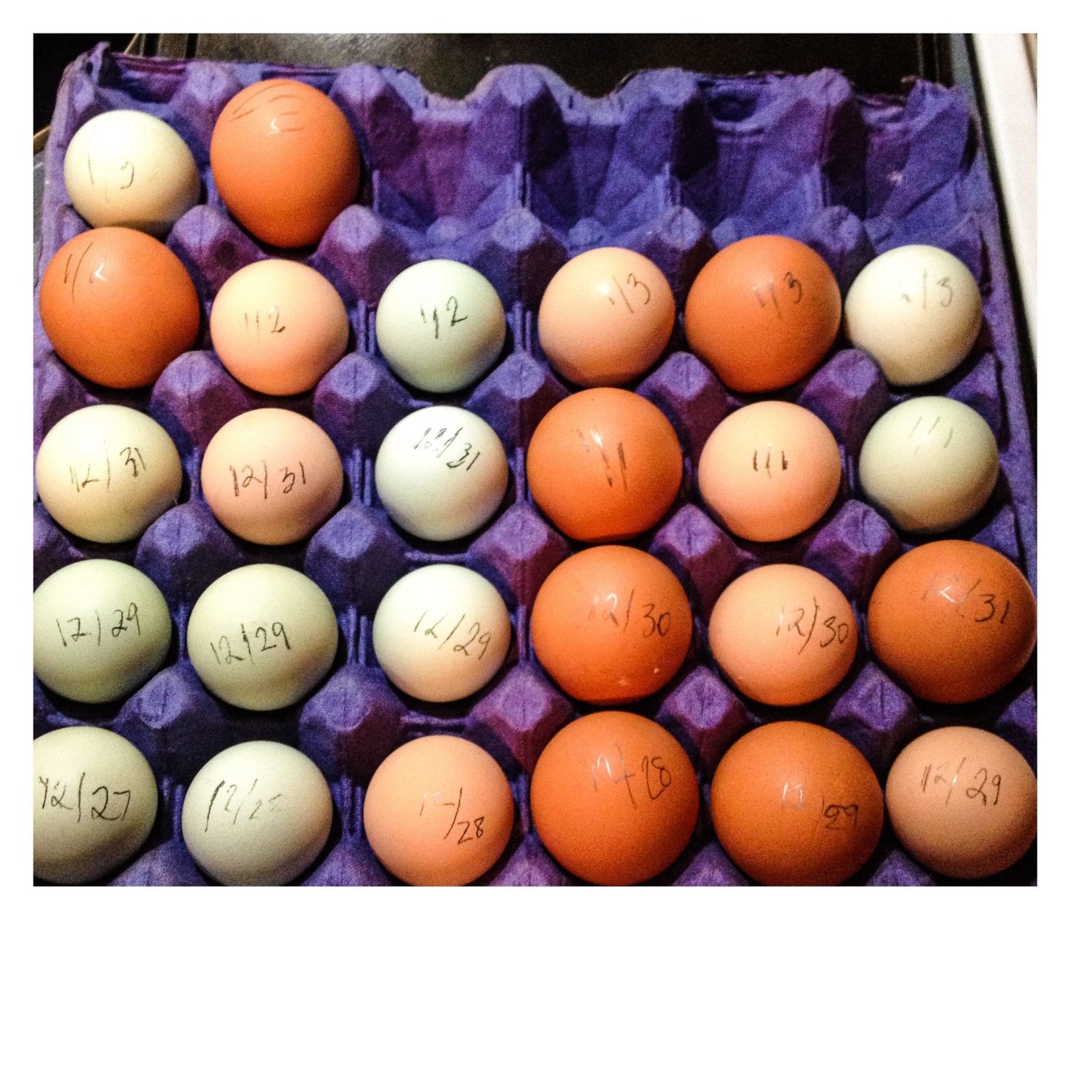 My fridge looks like Easter! Again, the color is off because of the lighting. This is 7 days worth of eggs! We write the dates on them as we gather, so we are sure to use the older ones first. Pictured: large rusty brown from my Red Star, medium pink from my BR, and the rest are medium various shades of blue and blue-green from my 3 EE's