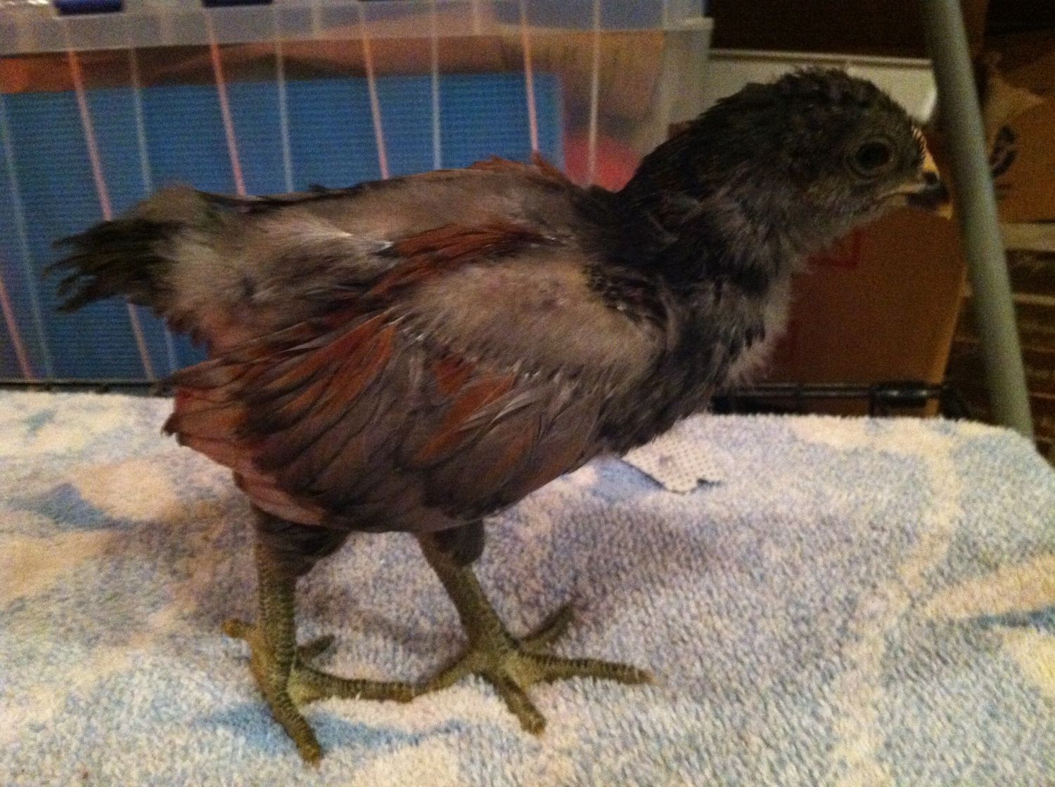 what color was the mom?It's hard to be certain. We had about 11 mature roosters at the time it was sired, but it was most likely our EE roo Gryffindor or our white rooster of uncertain breed. The mother of this chick was closed up with the white rooster for most of the time, so I'm leaning towards him as the papa.
