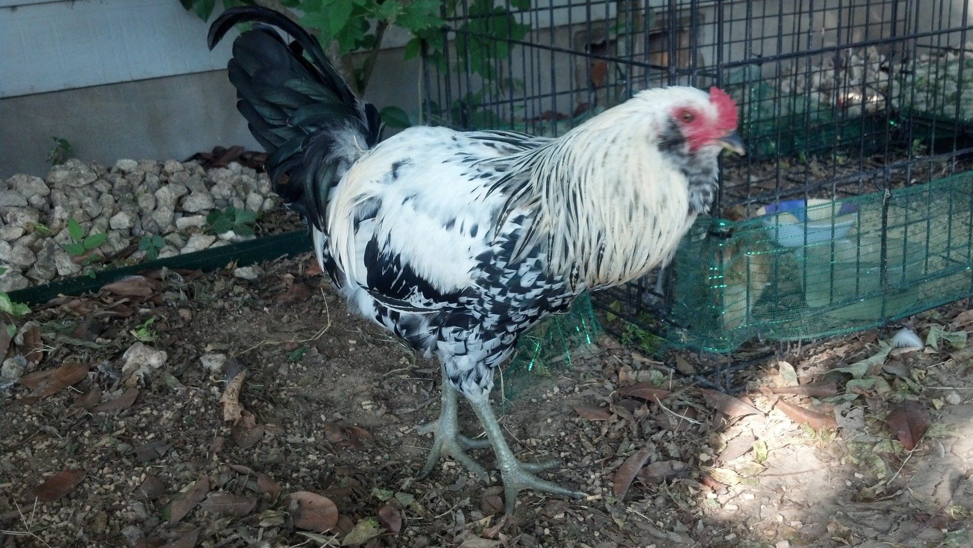 His name is Roo Roo because that was all he crowed the first morning we had him. He came from a free range acre a friend of mine has, but she had 4 roosters this year and was rehoming them. I was happy to have an EE Roo to add to the girls and he was so shy at first. Now he is bold and loud and very pet friendly. He knows who has the treats. We let him free range outside the run and he roosts on top of the coop. He refuses to go inside. He has a panic attack every time we go near it while holding him. I think he likes the freedom. He wakes us up promptly at 5:30 every morning. It's so sweet. He talks a lot! The girls are quite so far.