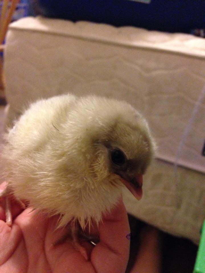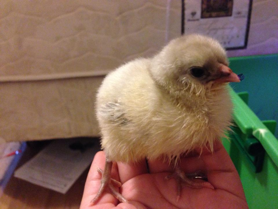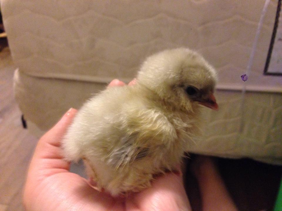 I'm not familiar with the term BBS, can you please tell me what that means? The Ameraucana chick I received is a splash according to other BYCers. Here she is, but these pics really don't do her justice because she had just gotten her poofy cheeks wet before I took them: