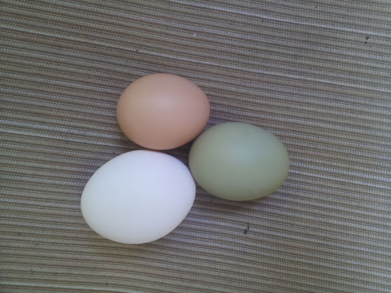 The brown one is from my Buff Orpington. The white is Eva, my Leghorn. And the green is from Bella (my ee pictured below).