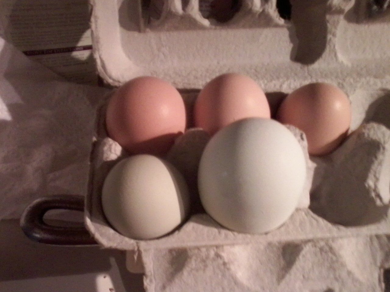 Bunny and transe were April chicks from 2014. They are both Easter eggers or americaunas. Transe got her name early on, she kept giving me the stink eye look and she's grown up to be a sweet hen! Bunny is shy but get a load of the huge eggs she produces! Both are great laying hens, they are still laying daily even with short days and 32 degree f temps at night! I must say, next to my production reds, these are my favorites!