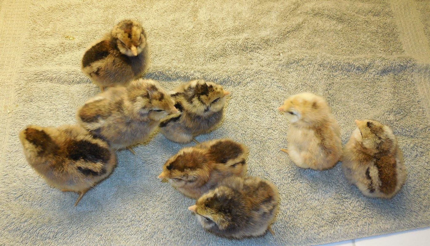 All 8 of my EE pullet eggs hatched on Saturday. They are 3/4 ameraucana and 1/4 cream legbar. Their mom was fairly solid colored as a chick, so I'm assuming they get their stripes from their daddy. I'm not sure where the crazy yellow colored one came from. LOL It is very difficult to get all eight of them to stand in one place for a photo.