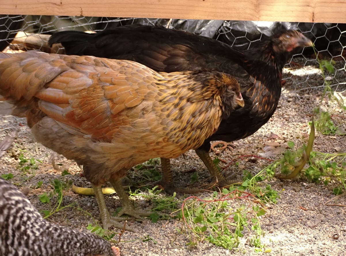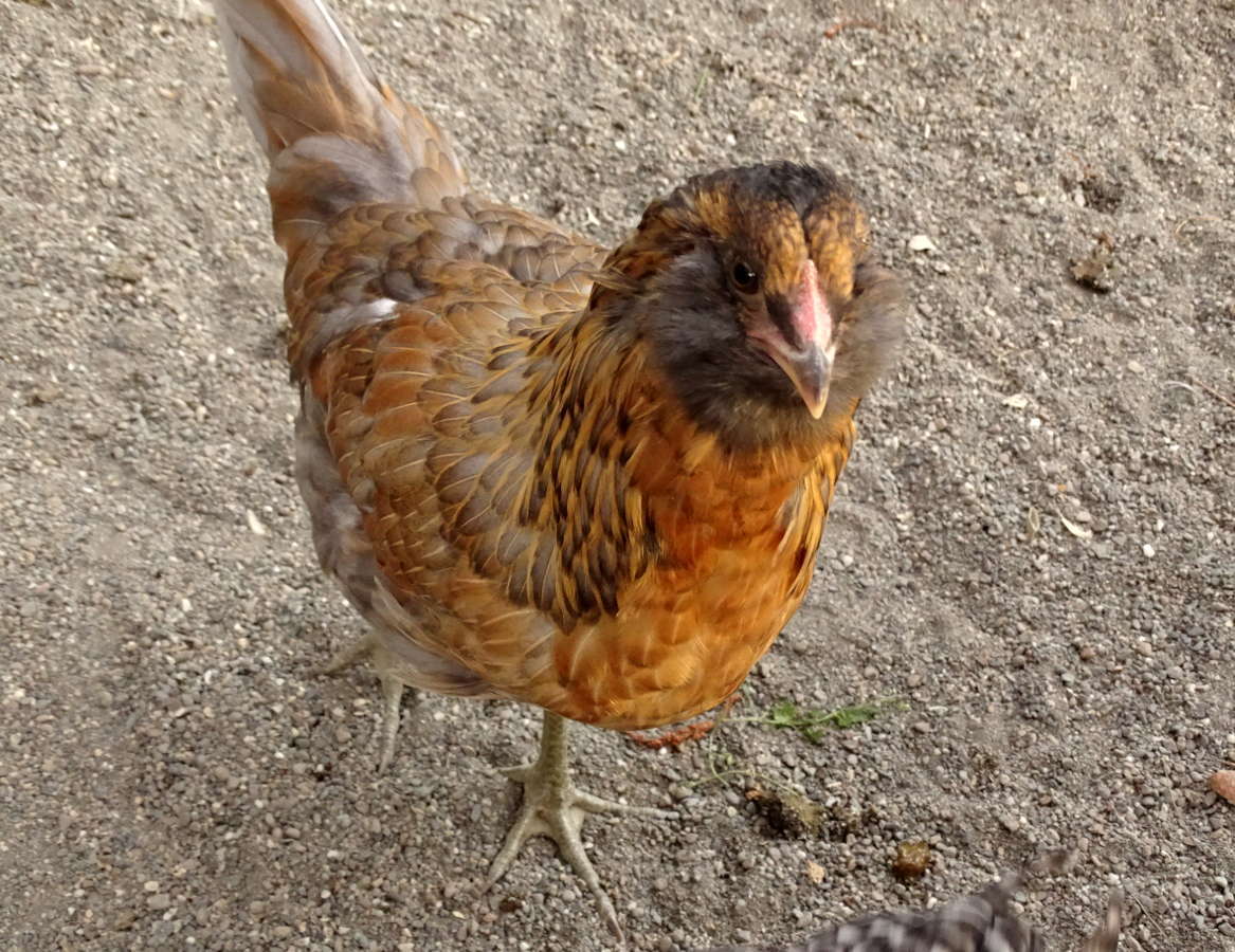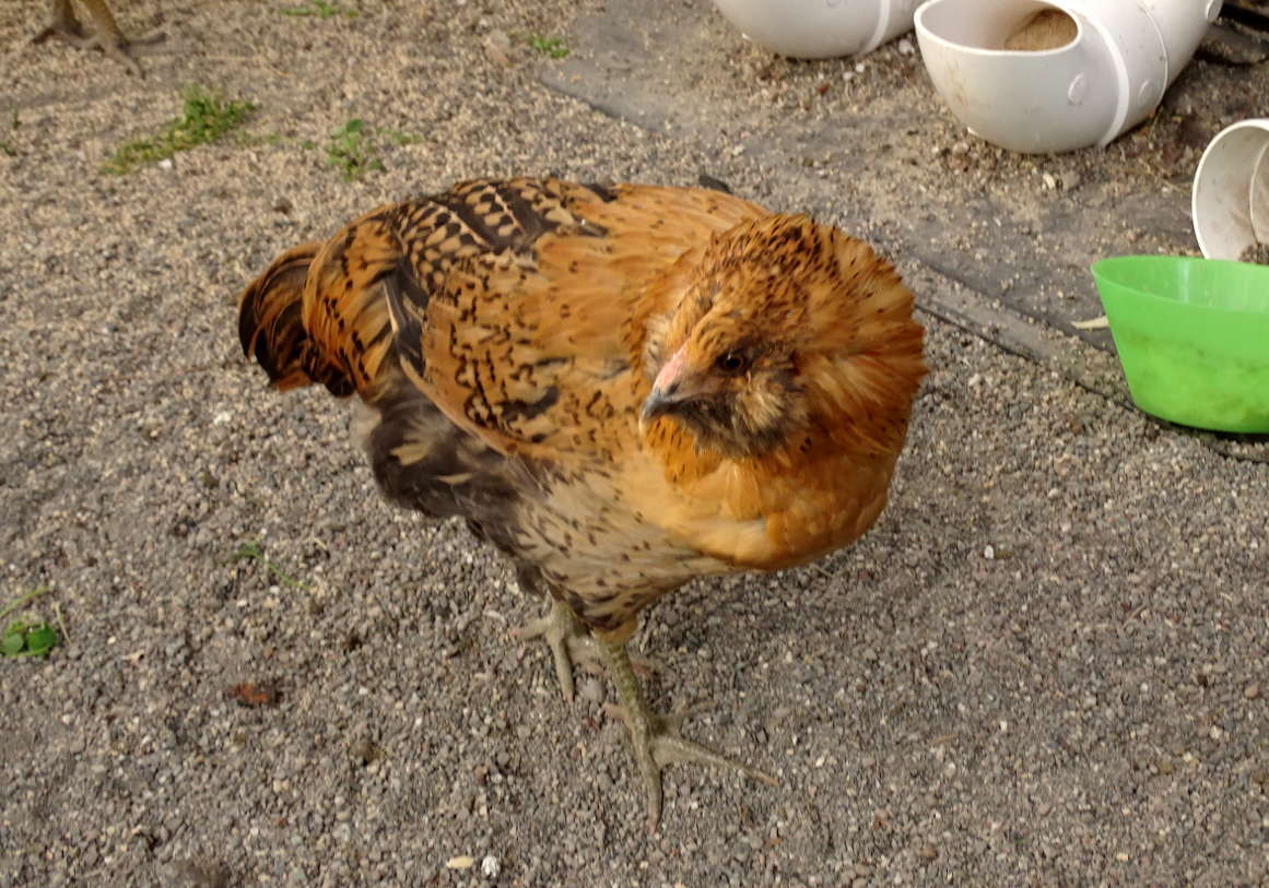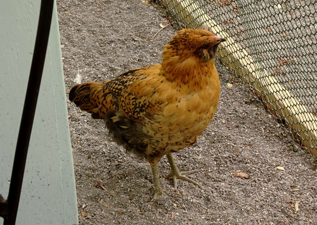 Wow the one wih the bright gold shiny feathers or Henrietta is absolutely one of the prettiest birds I have ever seen.My 2 EEs are the biggest brats going! They're about 11weeks old now and the biggest birds of my flock. They're the least friendly, and are just plain weirdos. They run around like a couple of goof-balls. They both hate to be held or touched. They run away and if you manage to catch one and hold them, they flap their wings and squirm and squawk like they're being killed! I sure hope they mellow out as they get older! This is Gertrude, aka Gertie-birdie. She's hard to get a good pic of. Always in motion.![]()