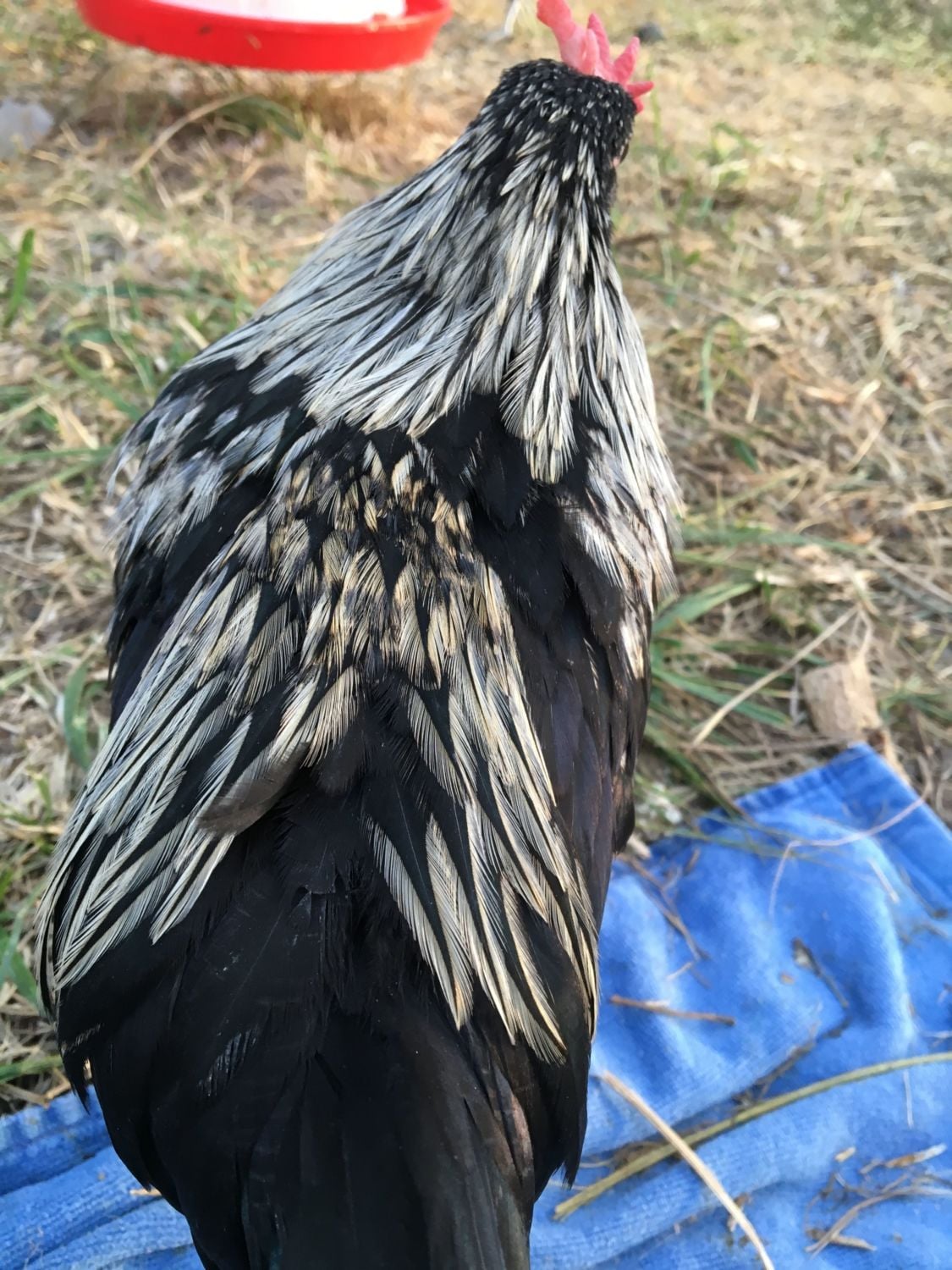 My EE holds out her head while my barred rock is preening, then the BR turns to her and picks out her beard and muff feathers! The EE rotates her head almost as if to give the BR easier access! The parts that are fully picked out are red because the BR nibbles at the exposed skin as well.