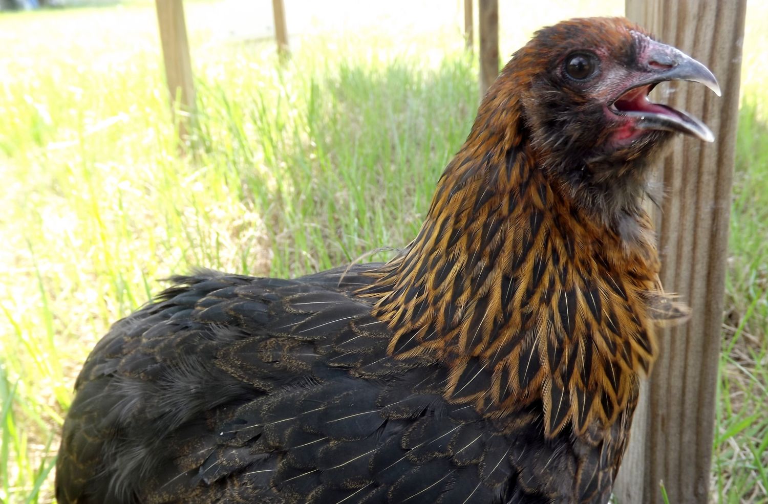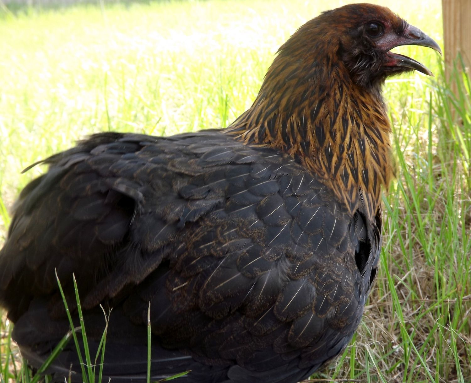 Your hen is so pretty. They all are. It is fun to see others with the orange and black heads like Hattie is developing. I am very impatient for her to get her big bird plumage. Too bad I don't have space for 12 or 20 of them, just to see the gorgeous colors.