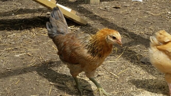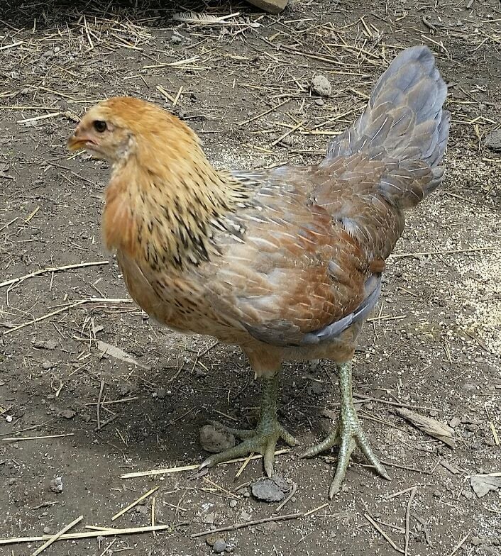 This is our 11 week old Easter Egger. I'm a little concerned that she is actually a rooster based on the tail length compared to our other chickens and that nice long mane coming in around her neck. S/he has a very short comb, but I believe easter egger roosters don't get a large comb? (Could be wrong on that.) What do you all think? S/he also has little buds on her ankles where roosters grow their spurs. Just nubs, but still. S/he is the boss of the flock as well. Her tail is not always held up like pictured below, so it's throwing me off and keeping me guessing.
