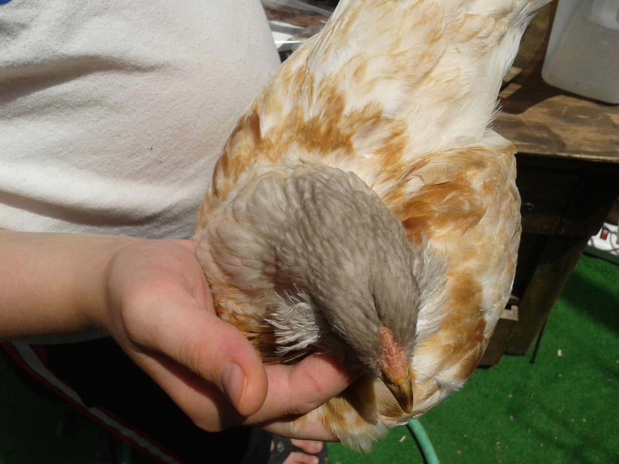This chick turned away just as I snapped the picture. It has almost no comb showing and what's there has no pink. The face is very "pretty"