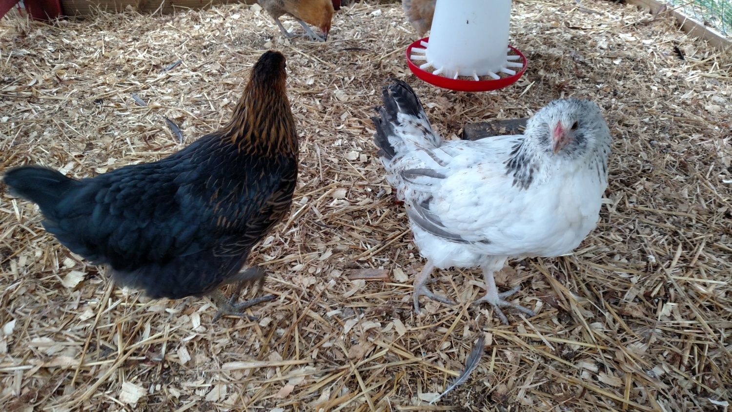 No idea what your bantams are. Your Ameraucana are Easter Eggers. True Ameraucana are always sold as specific color varieties. If no variety is specified, it's probably an Easter Egger. All are much to young to even guess at gender.Can anyone tell me if my chicks are pullets or cockerels? I have two Bantams and two Ameraucanas. I have heard that there are many types of Bantams and Ameraucanas. I was told that Bantam #1 looks like a Porcelain D'uccle. I was also told that my 2 Ameraucanas look like Easter Eggers. Can anyone clarify what types of Bantams and Ameraucanas I have? I know that they are very young to tell the gender, but I am so anxious.