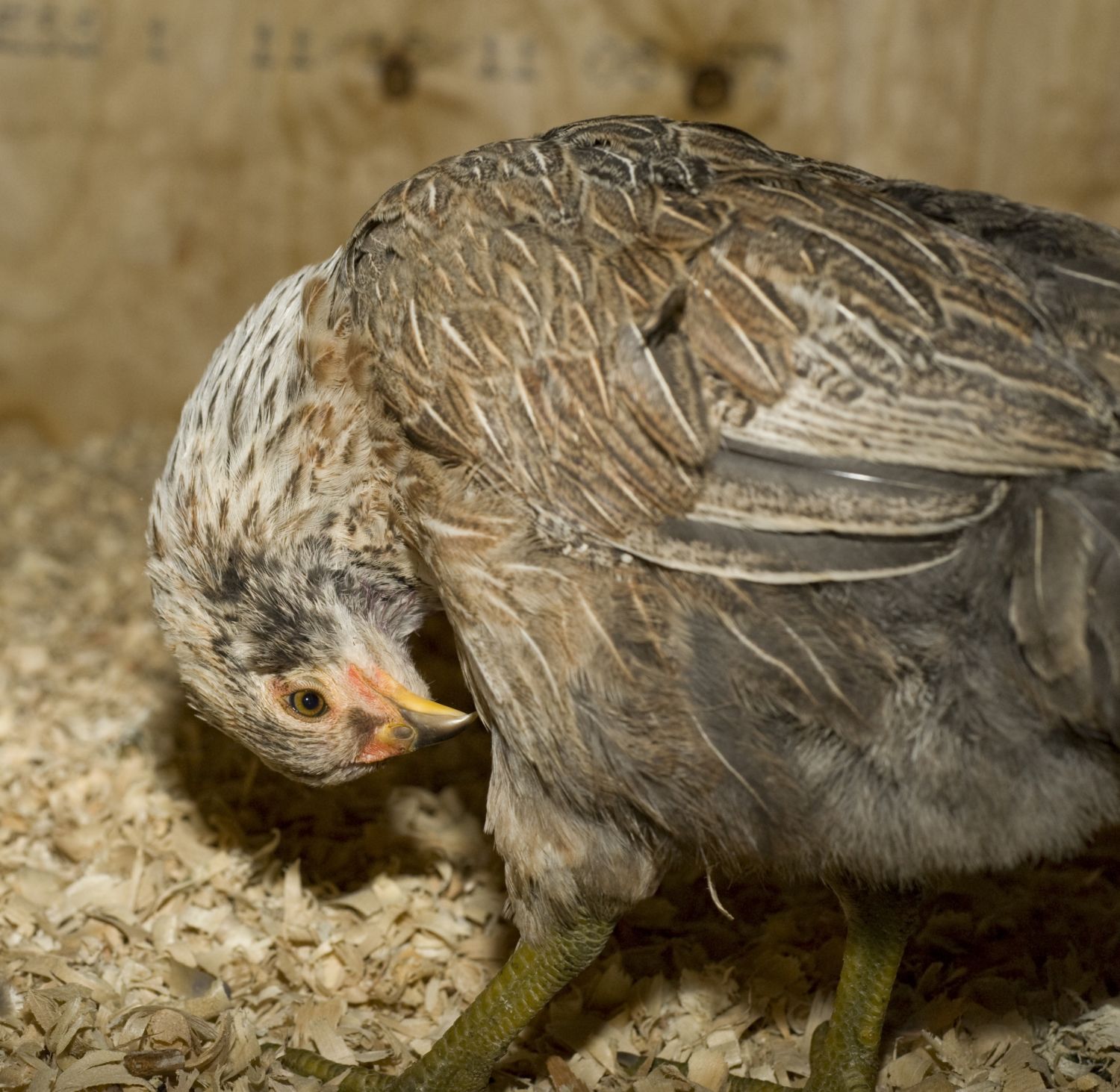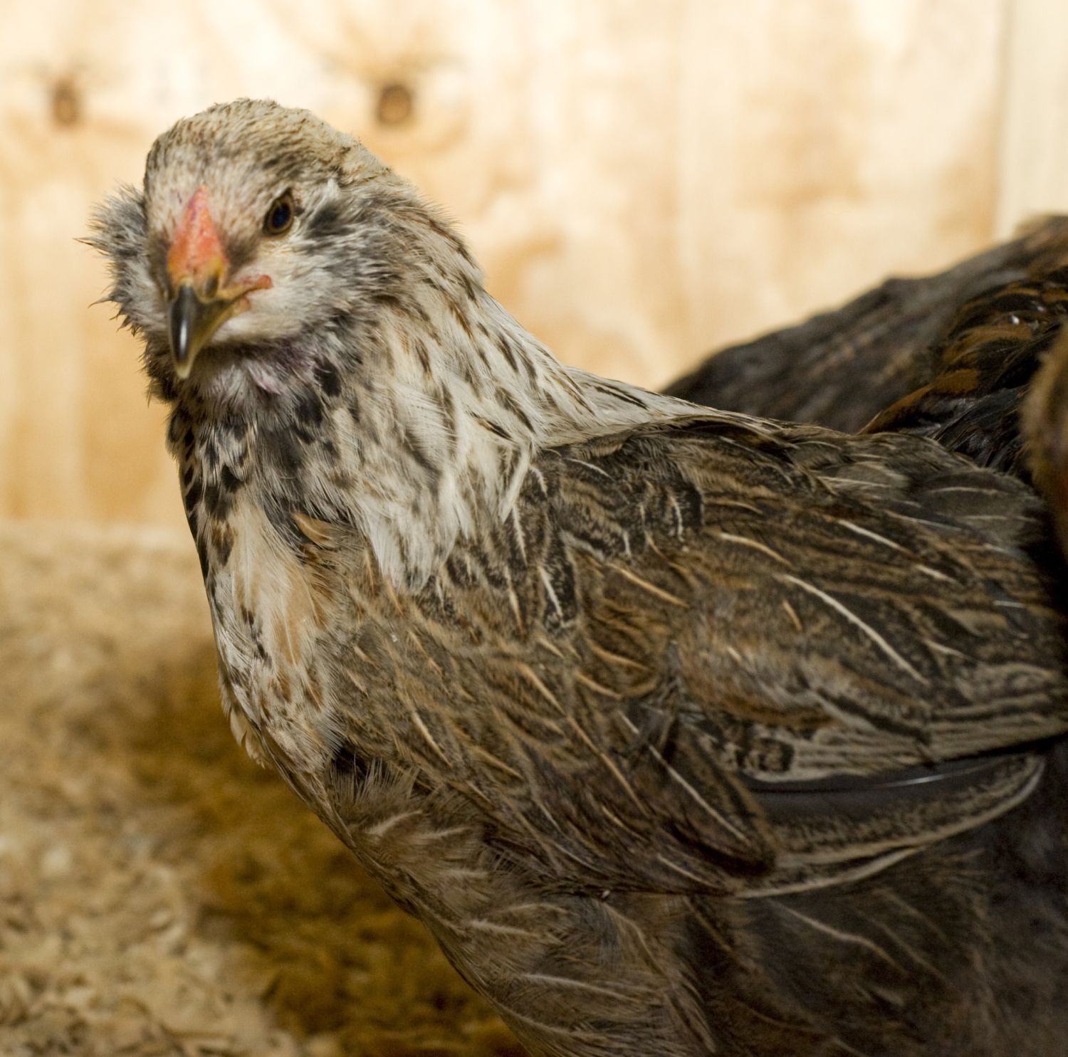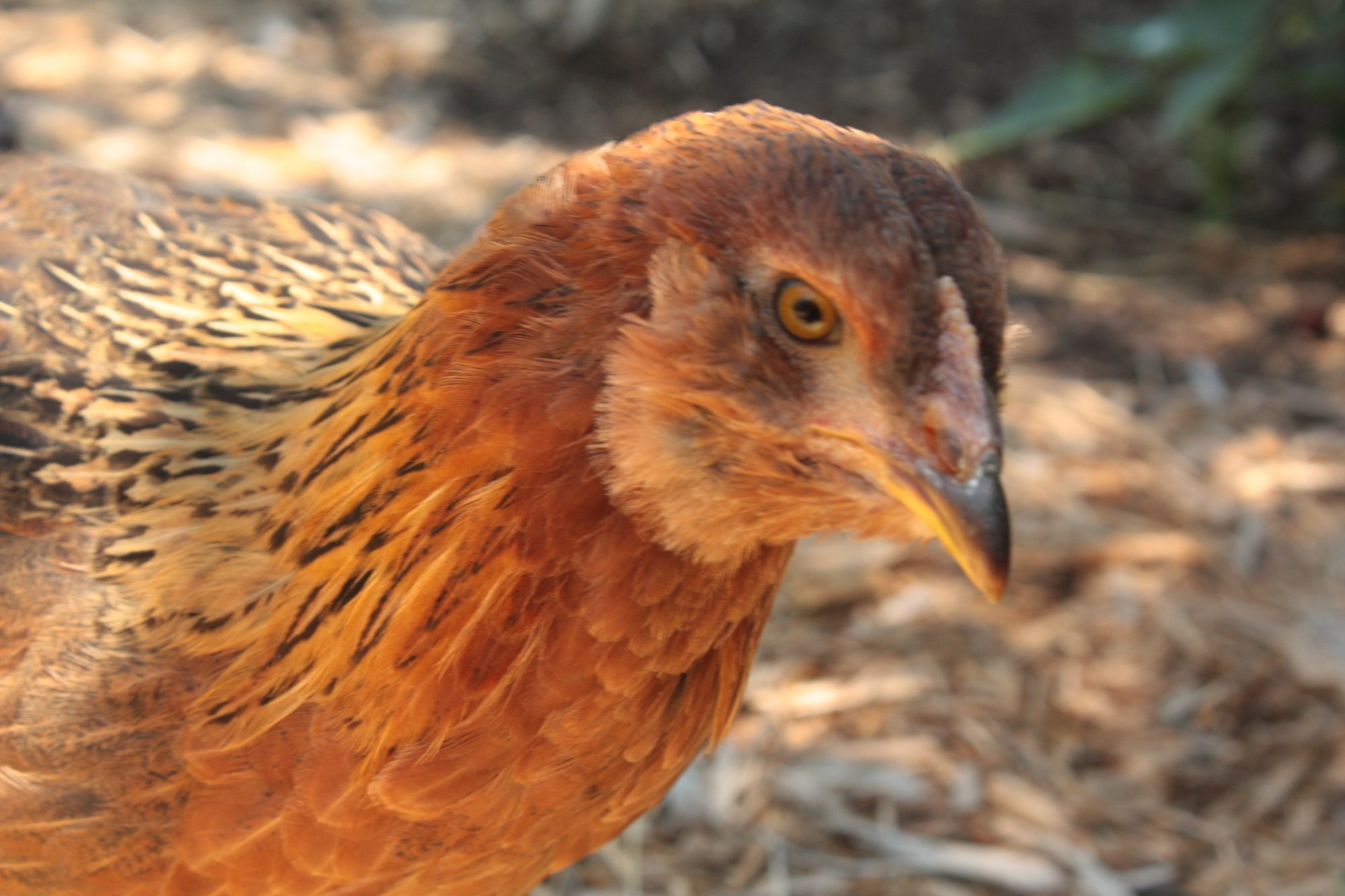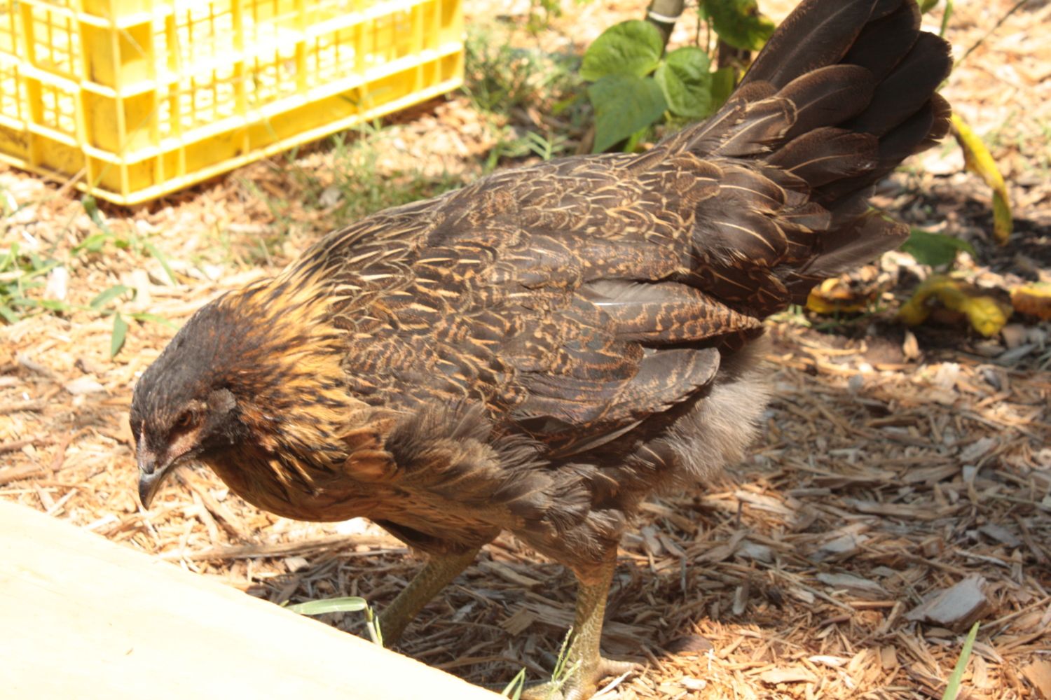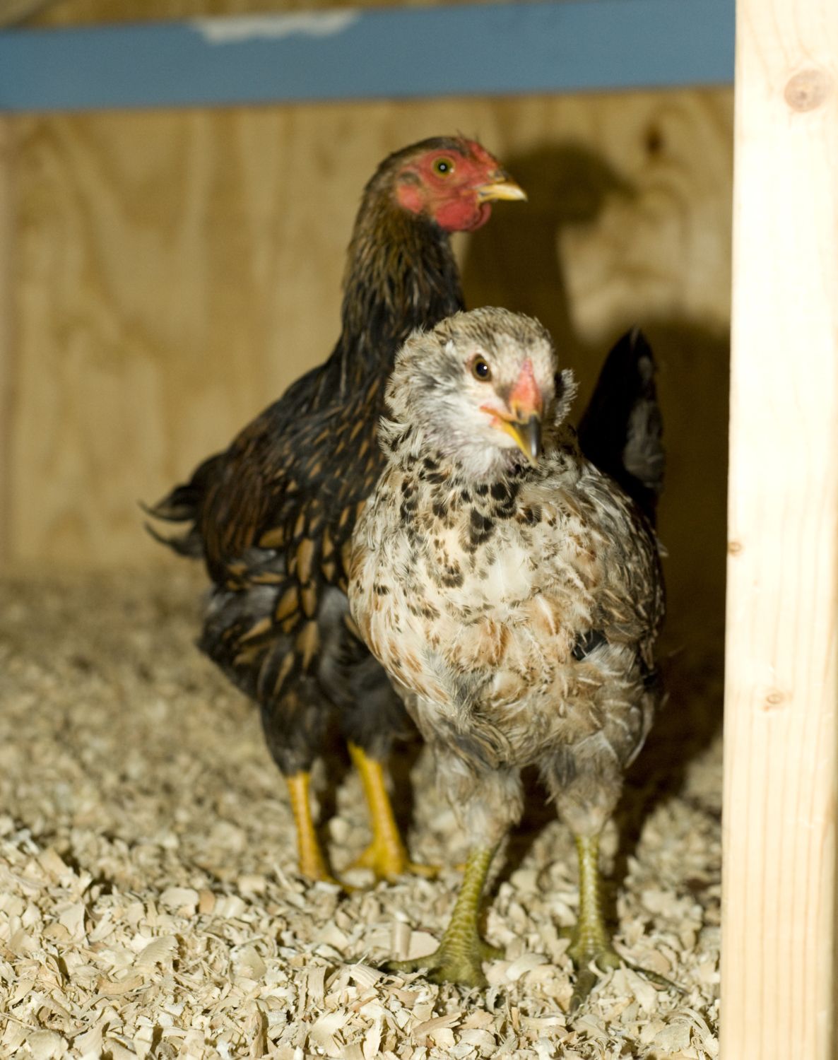 And here is his hatchmate Speckles, with broody mom Goldie.