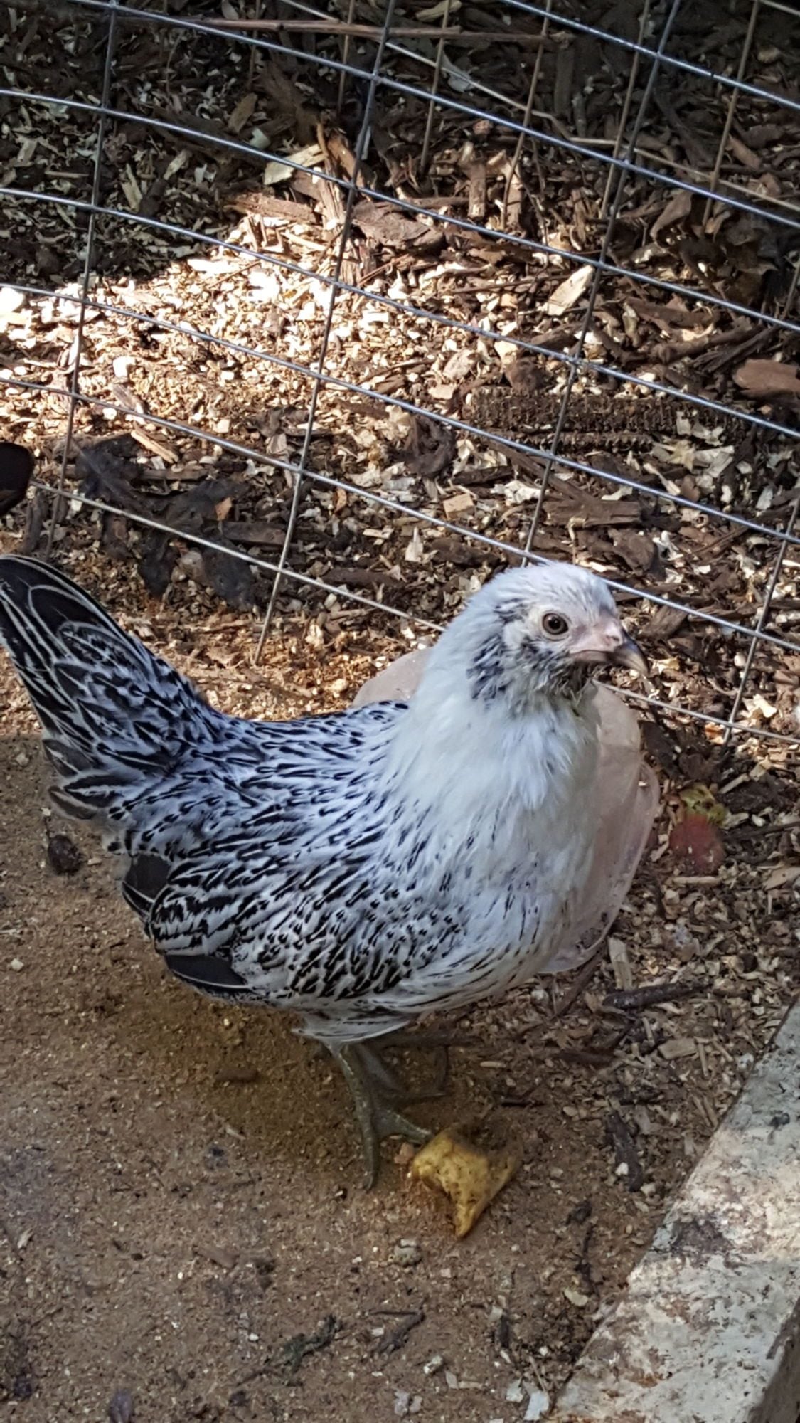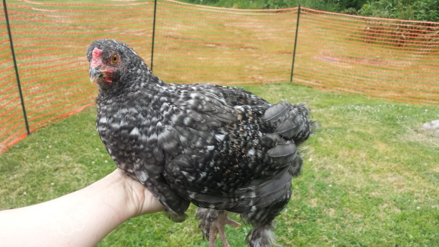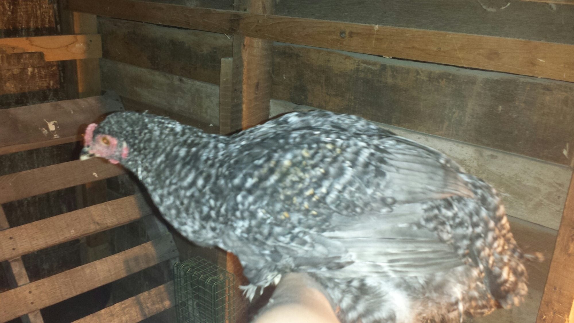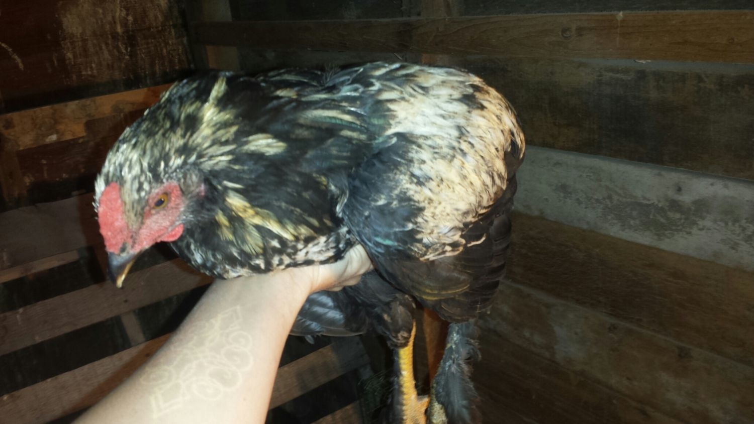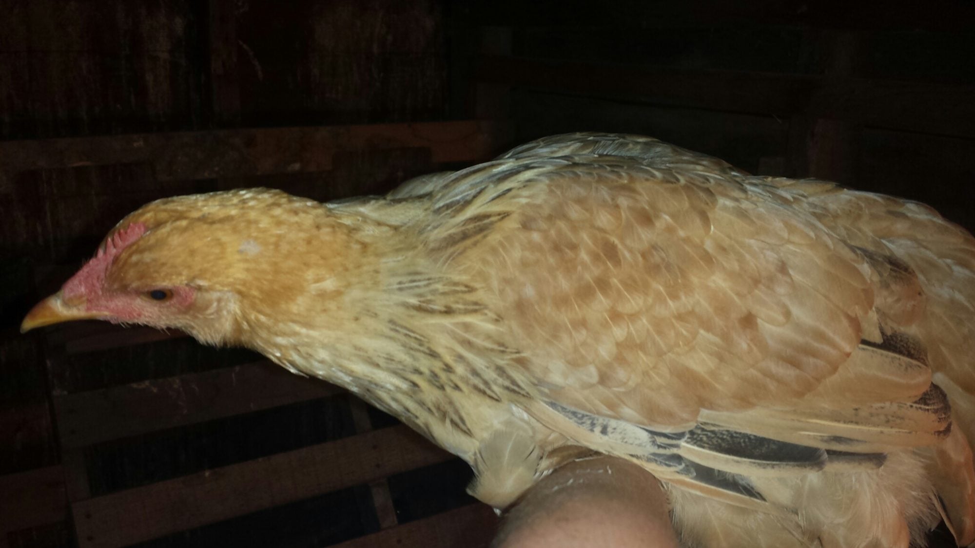 The comb is redder than I thought. The place I am trying to see is the side of the chicken near the base of the tail. A male will have long, narrow, pointed saddle feathers. A pullet will have shorter, blunt, rounded feathers that look like the rest of the body feathers. I can't see the area here, those funky wing feathers are in the way.